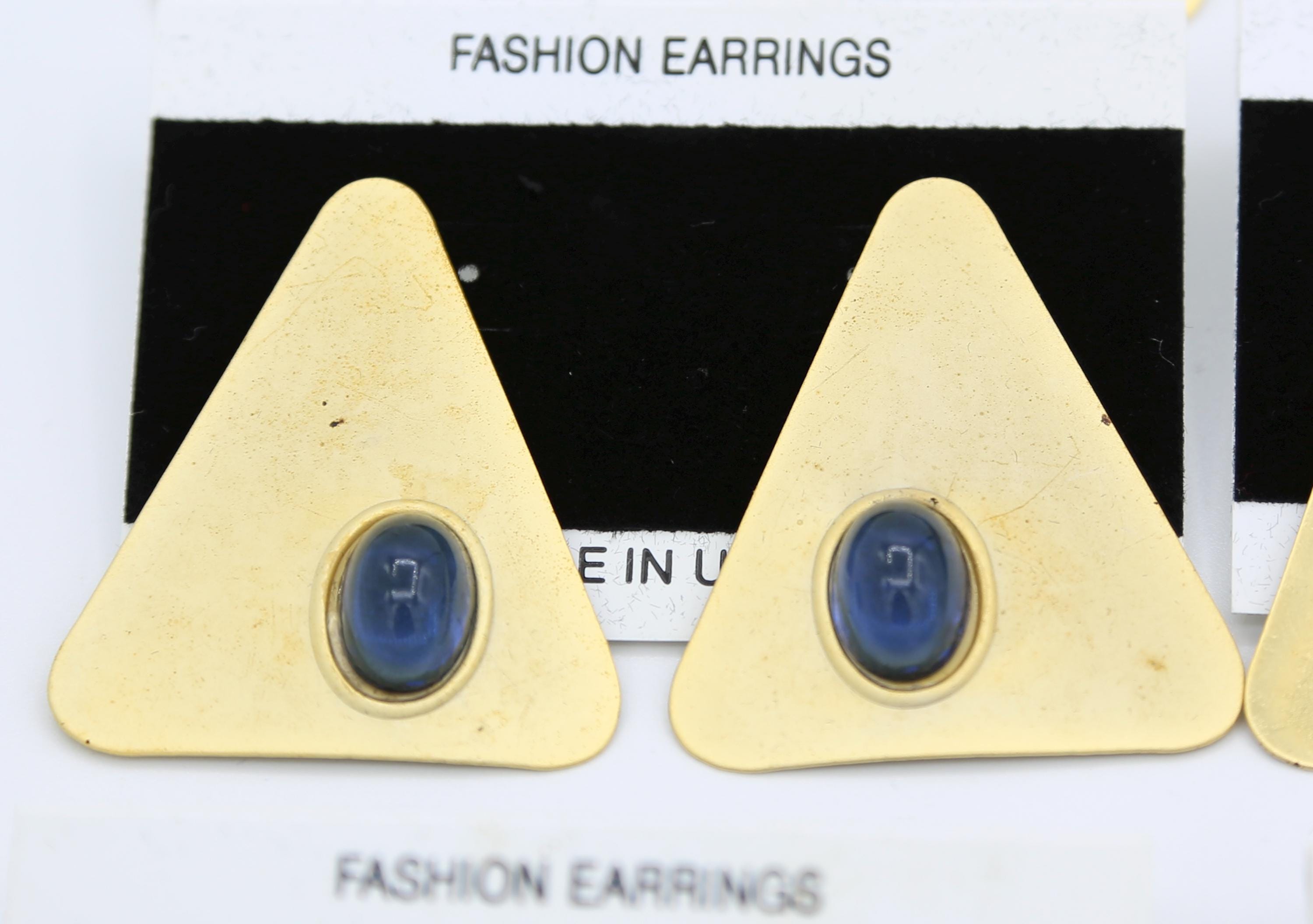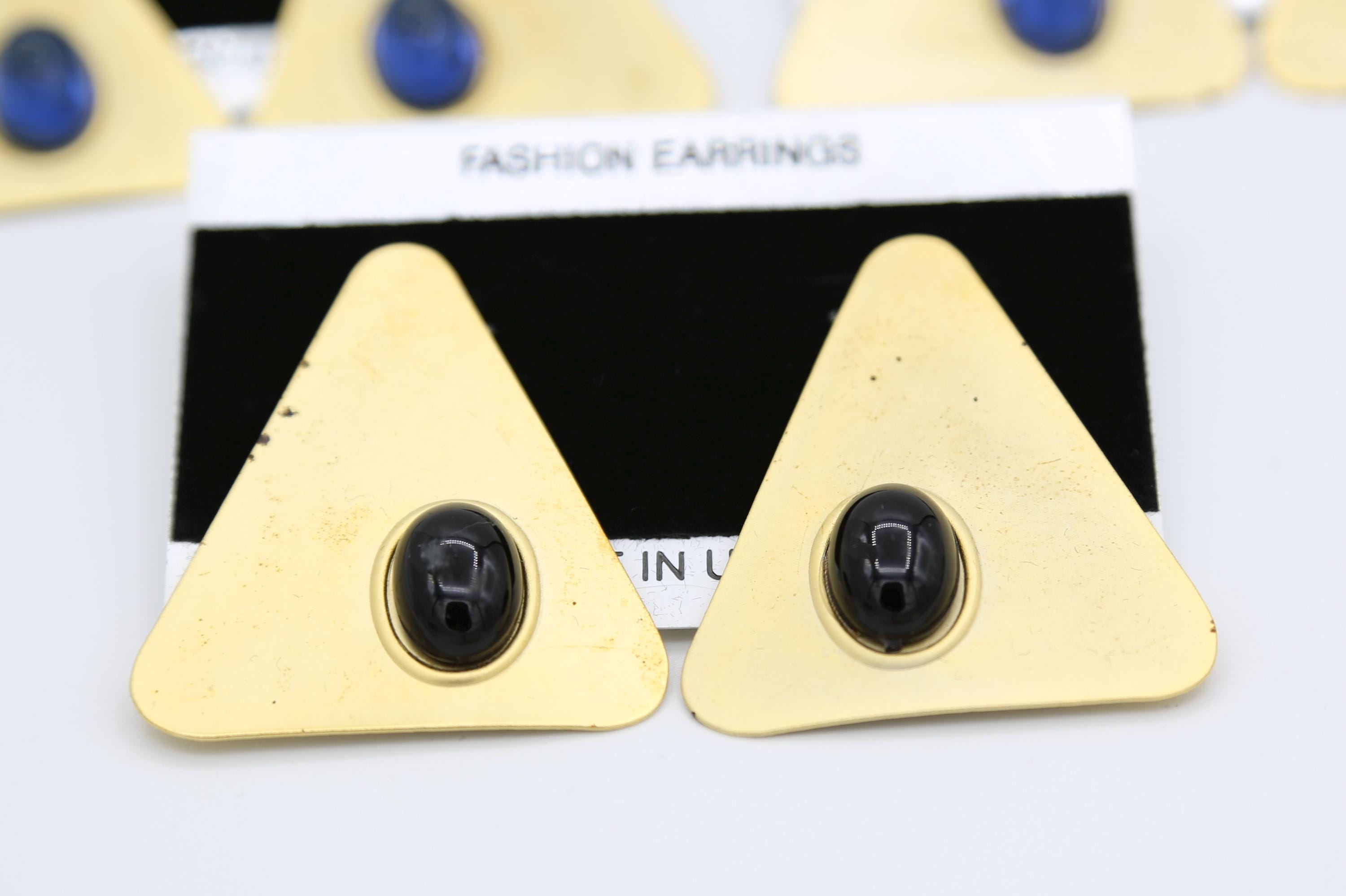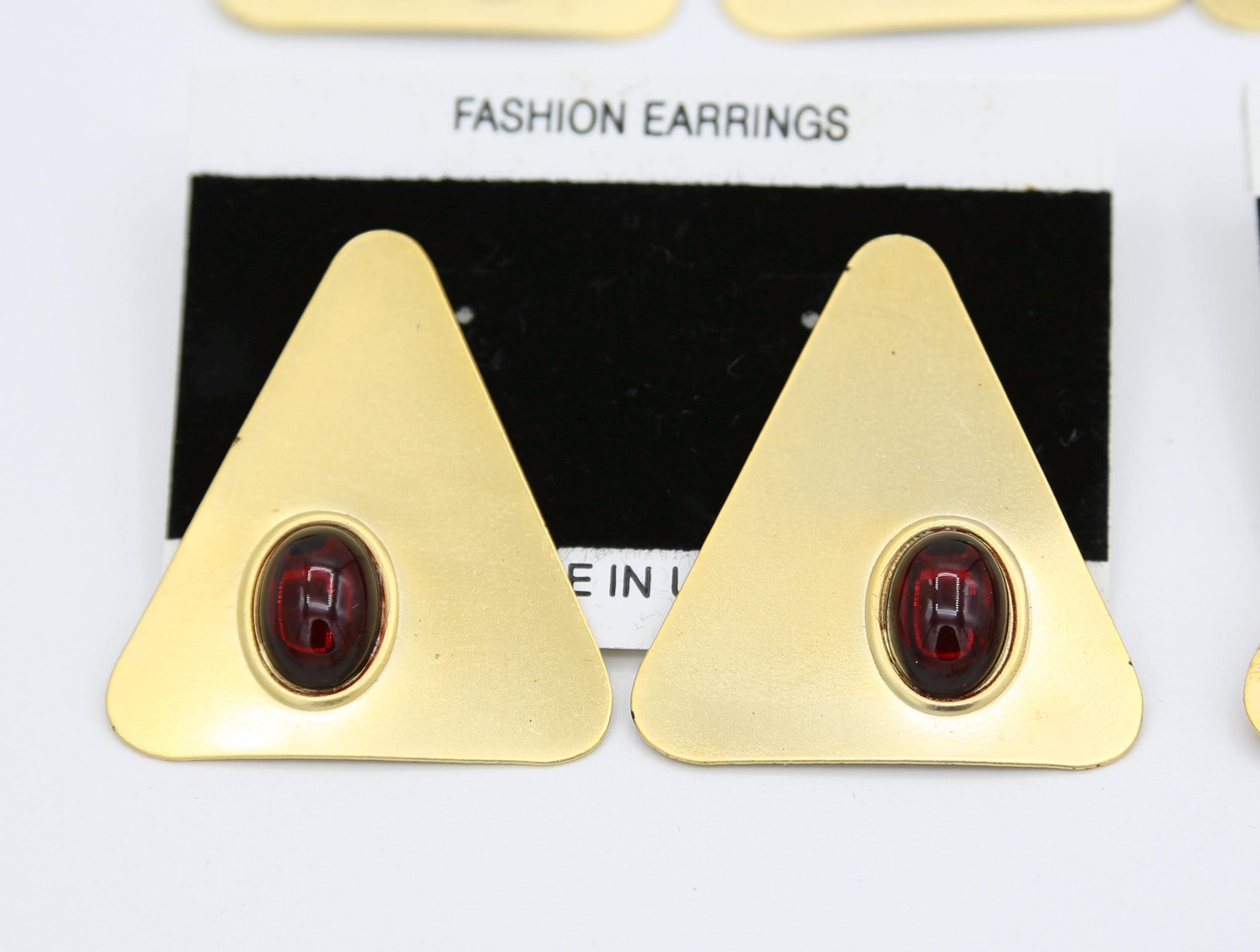 They feature colorful oval cabochons set in a thin metal, matte gold tone triangle with top mounted posts for pierced ears.