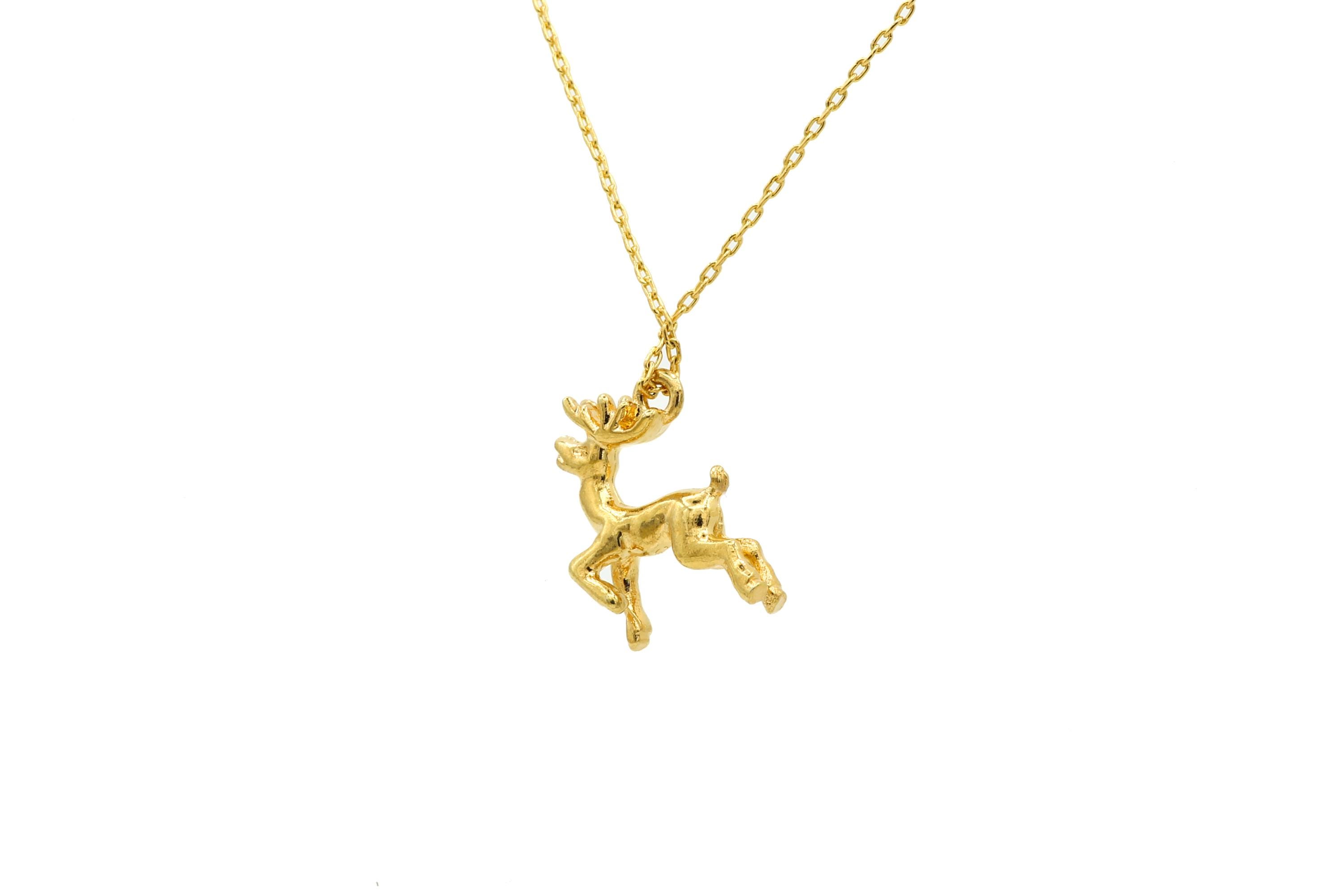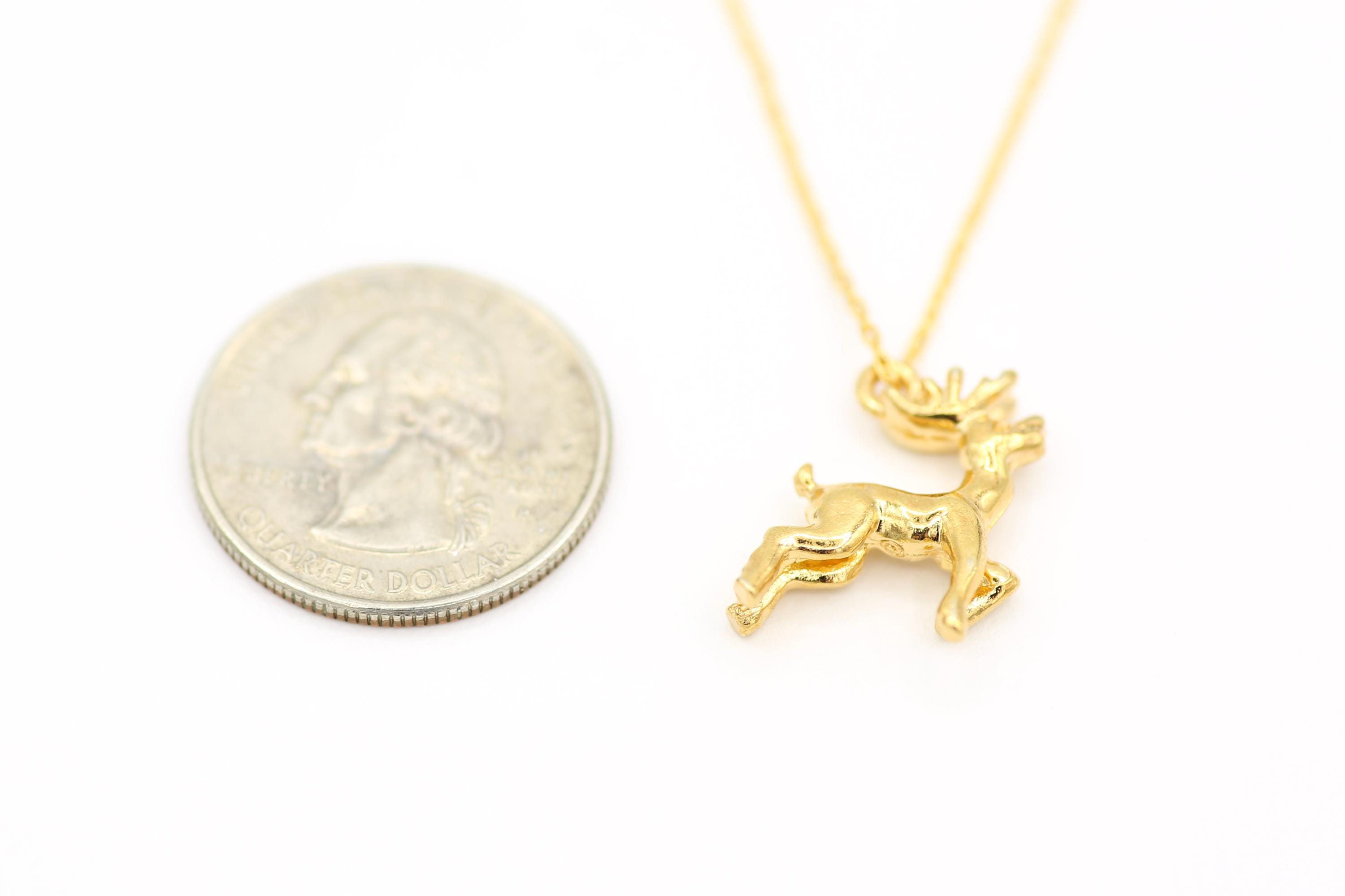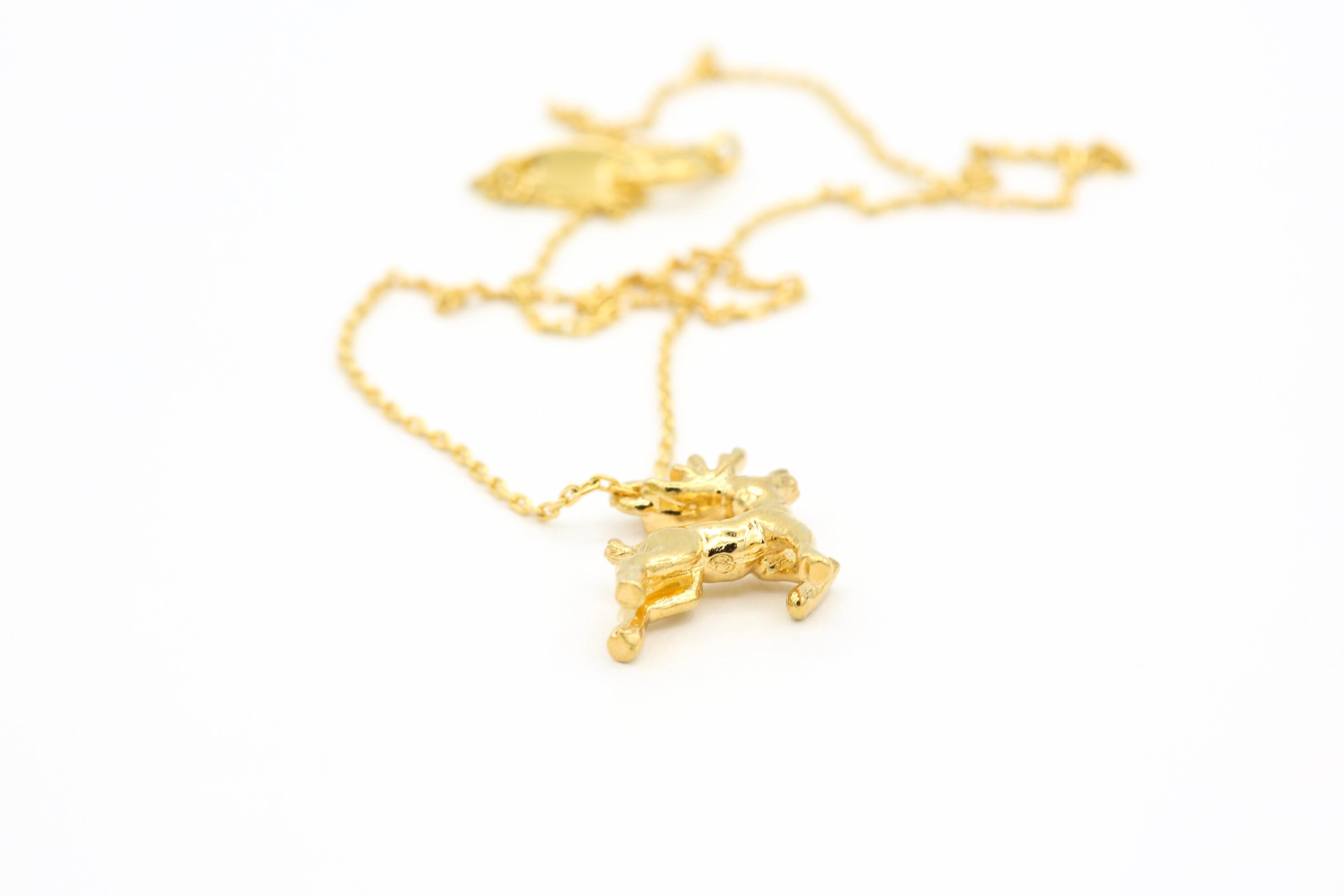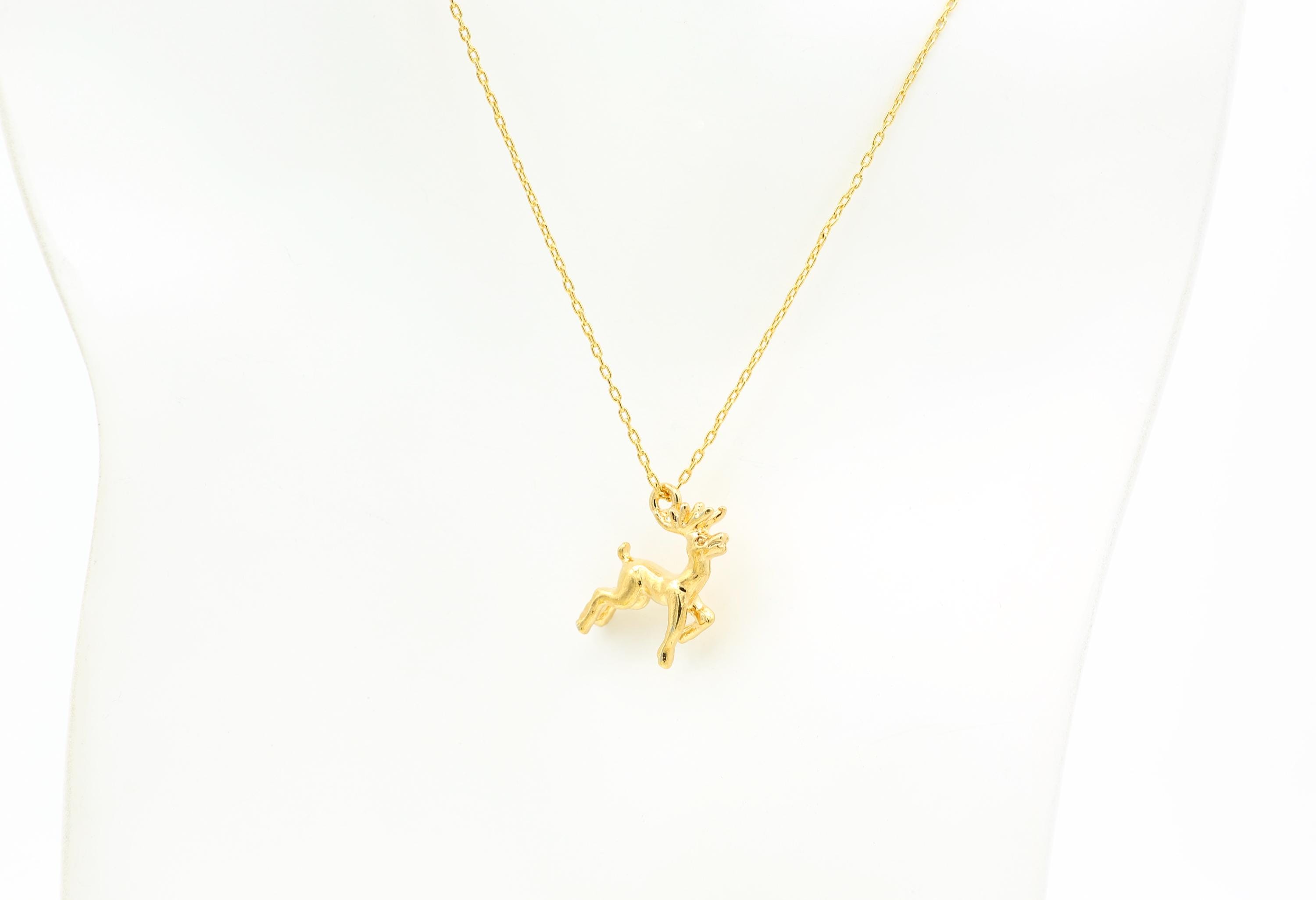 This adorable and festive necklace features a vintage 3-D gold plated reindeer pendant that hangs from a 17" gold plated chain with a spring ring clasp.