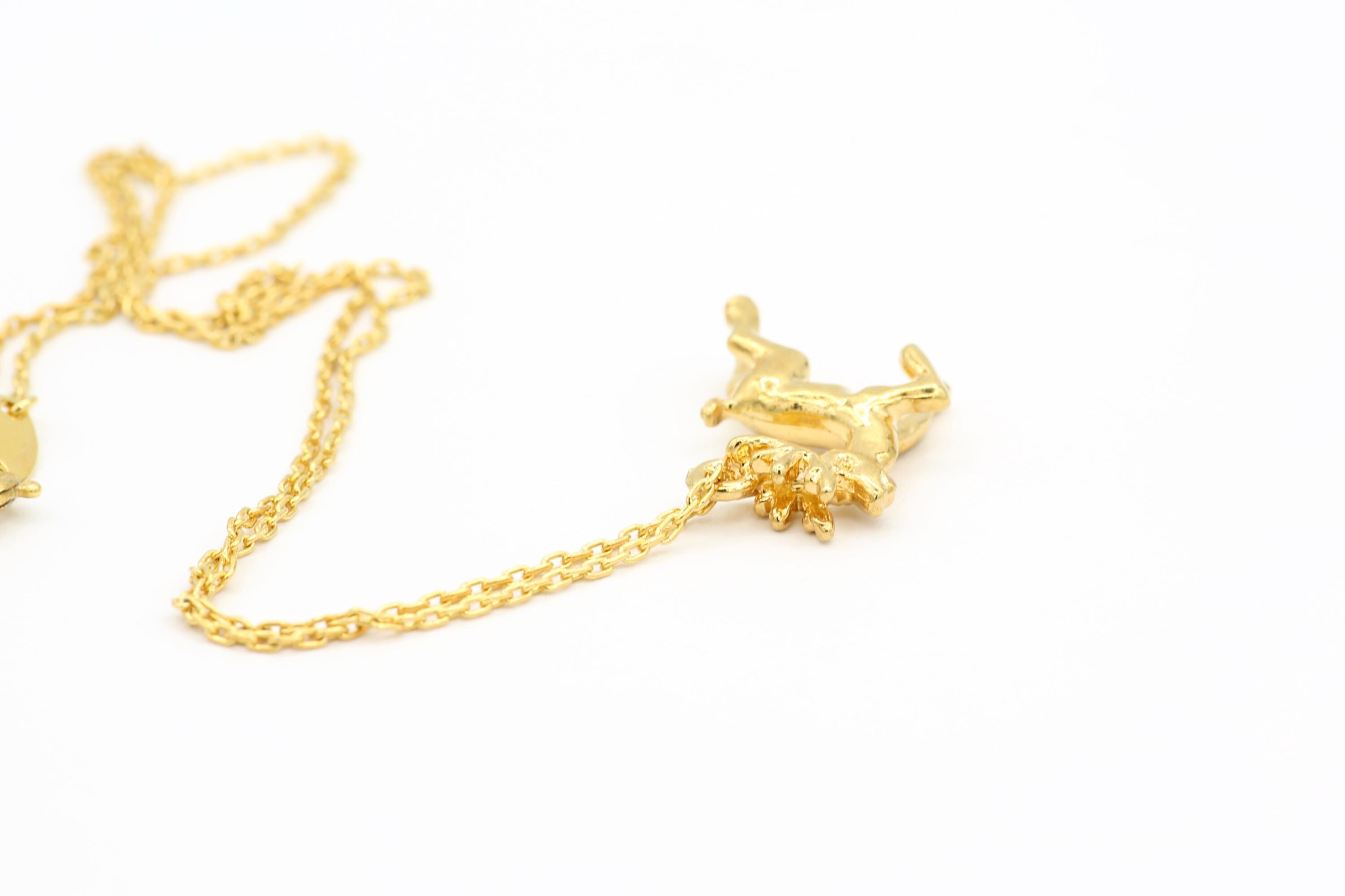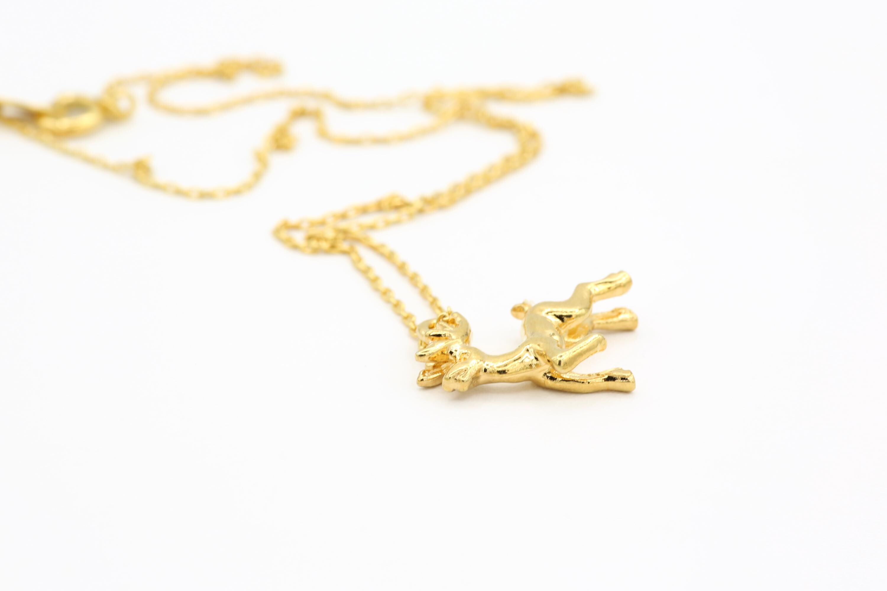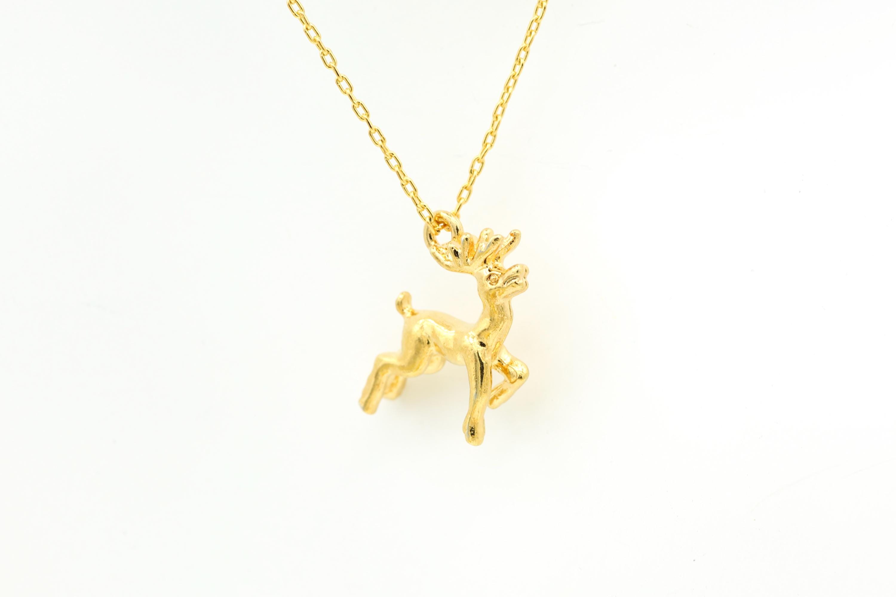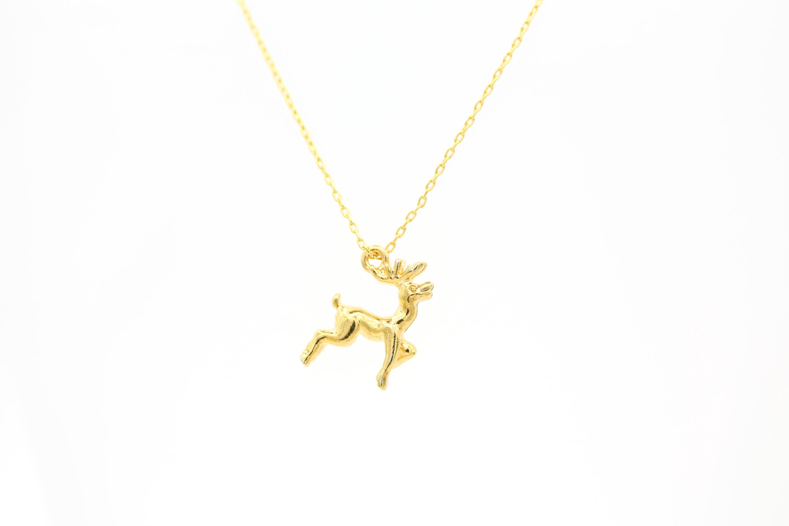 This adorable and festive necklace features a vintage 3-D gold plated reindeer pendant that hangs from a 17" gold plated chain with a spring ring clasp.