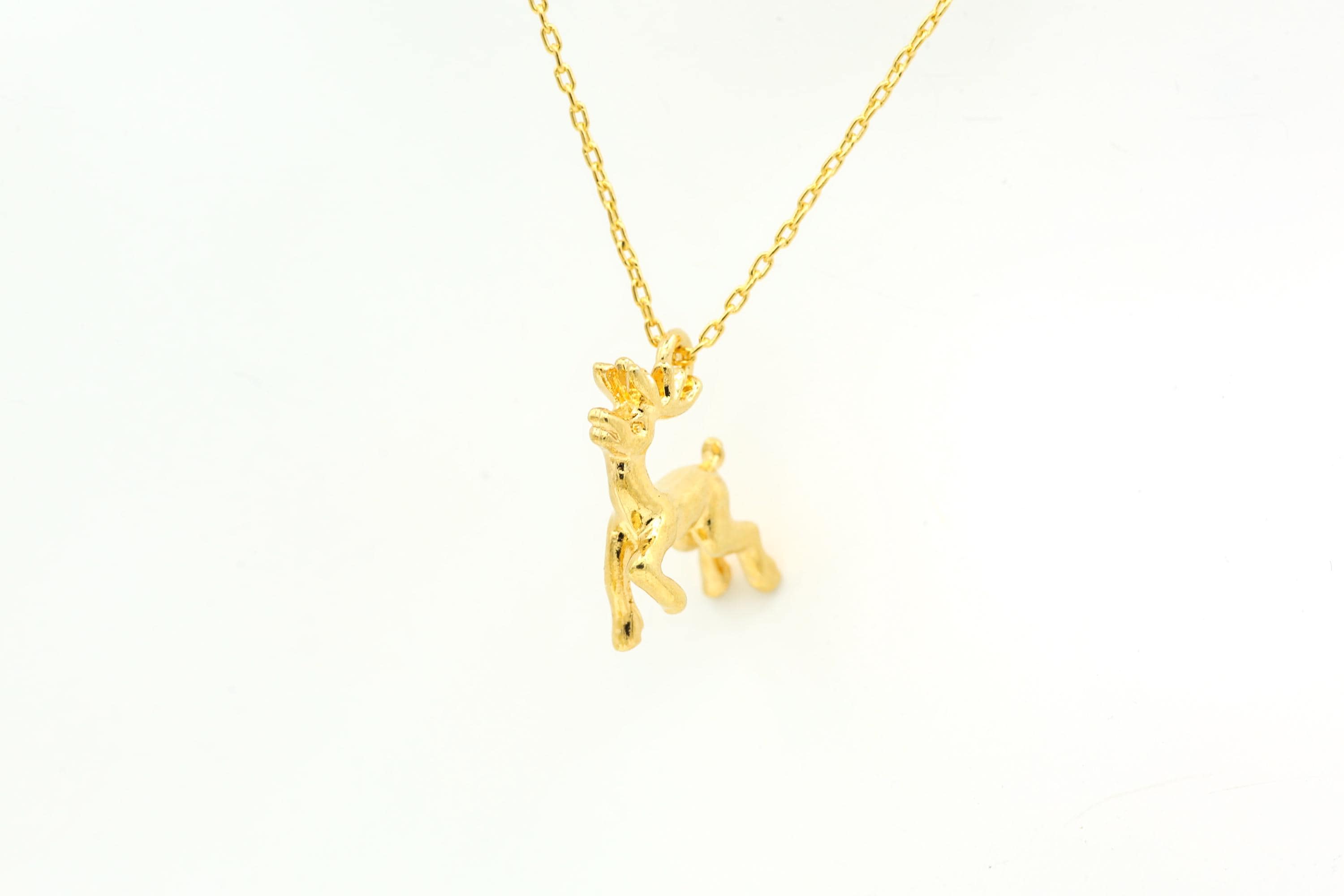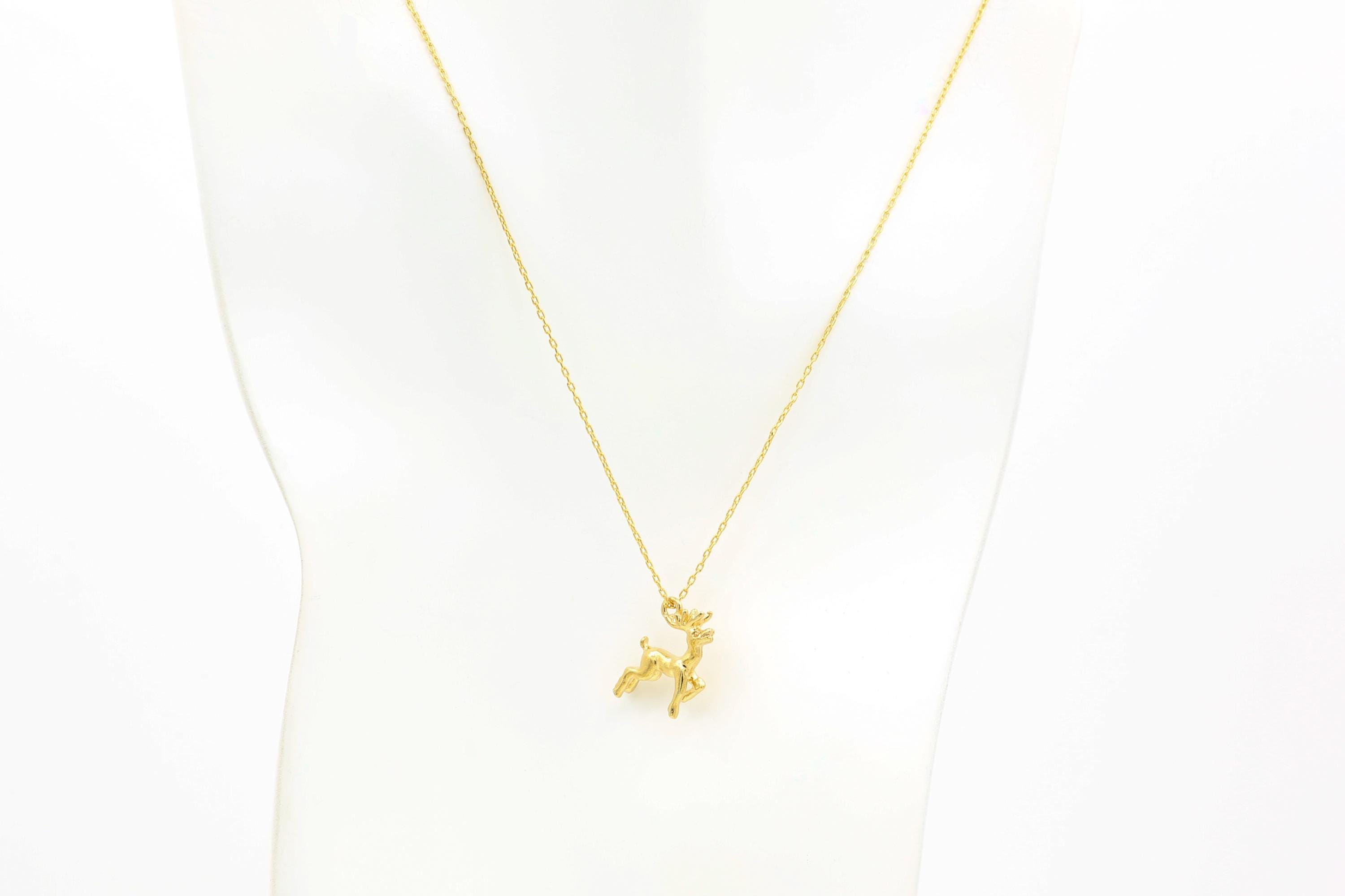 Vintage Gold Tone Reindeer Pendant Necklace: Christmas Holiday 3-D Deer Charm.