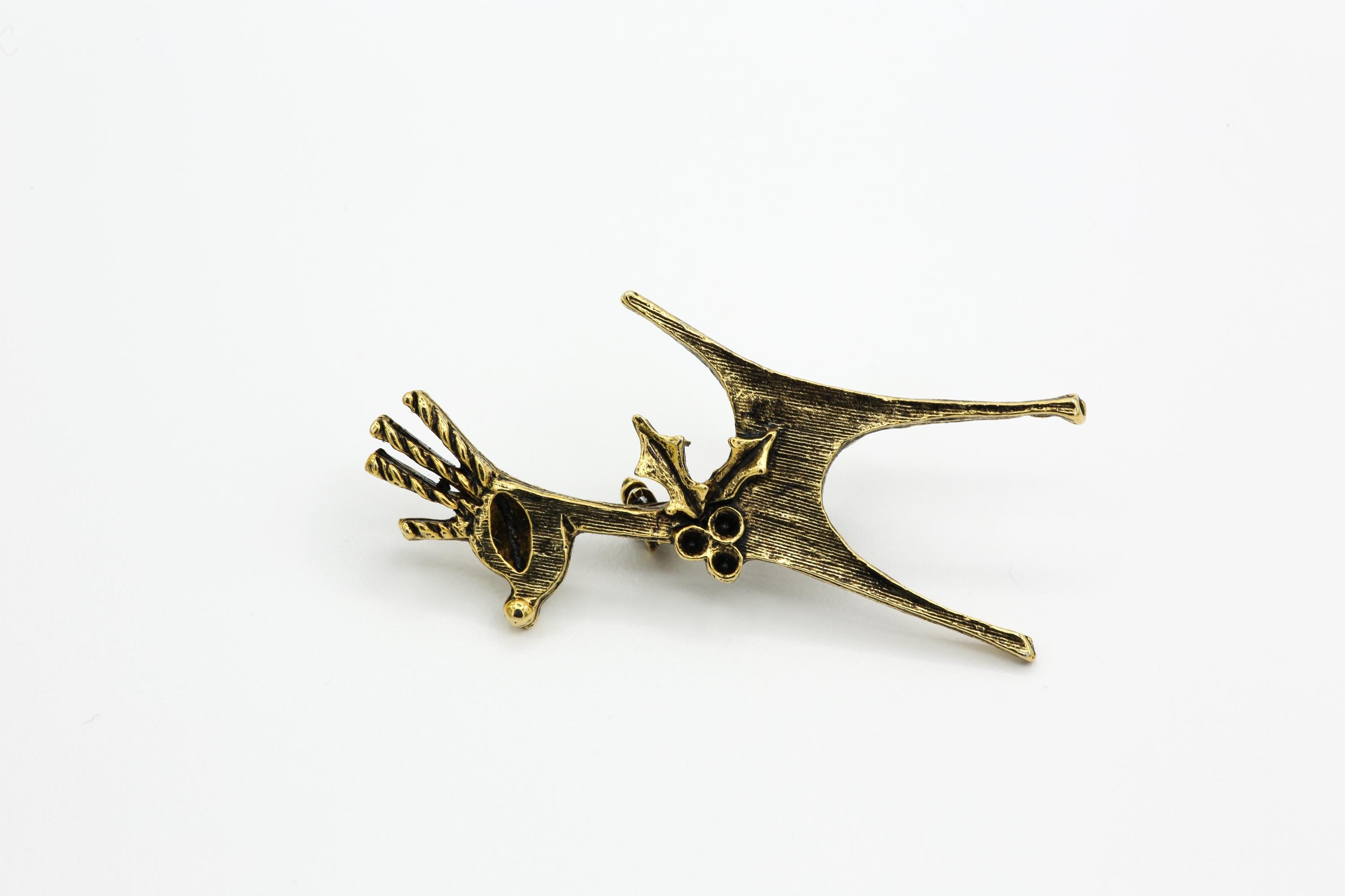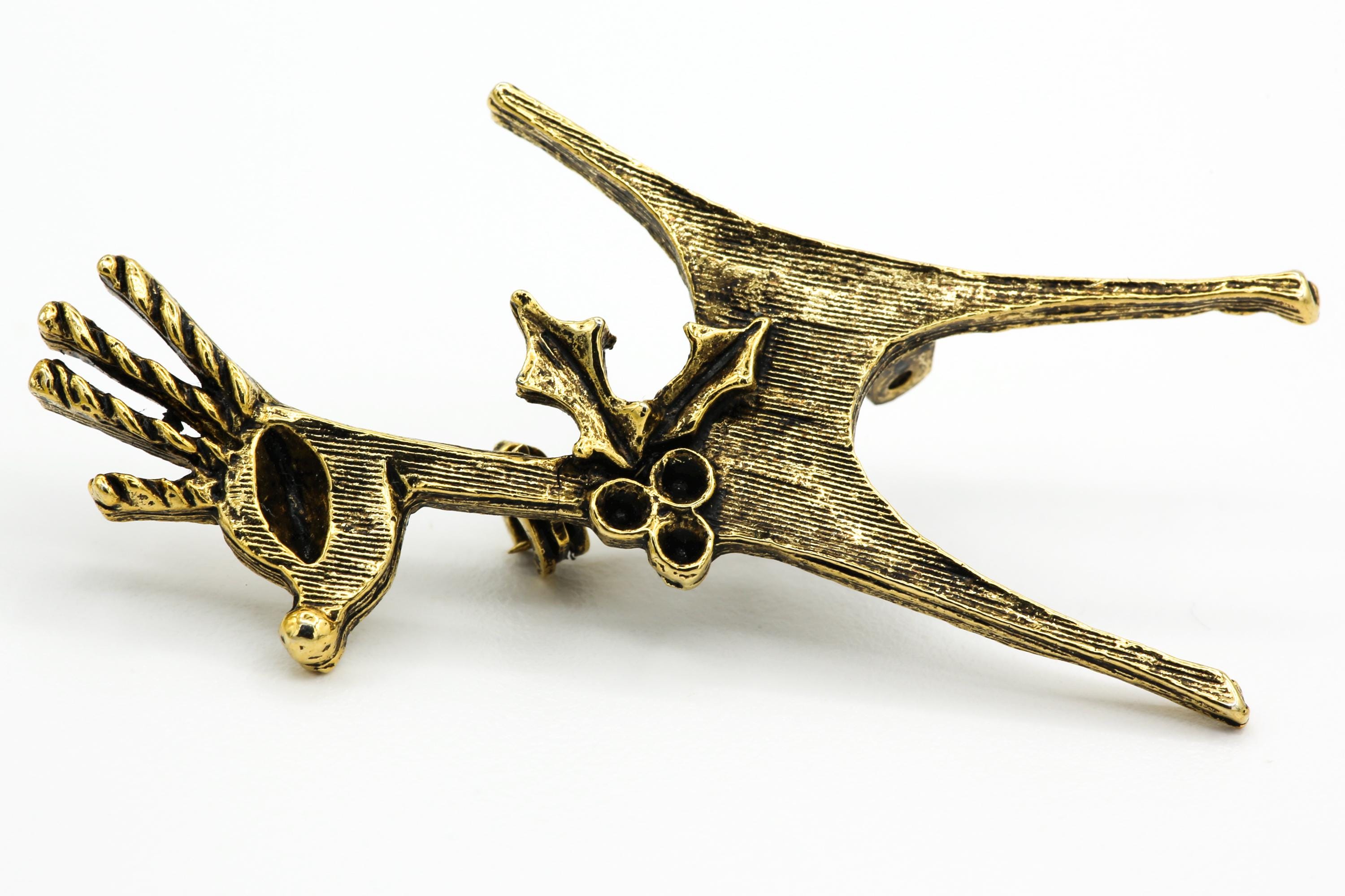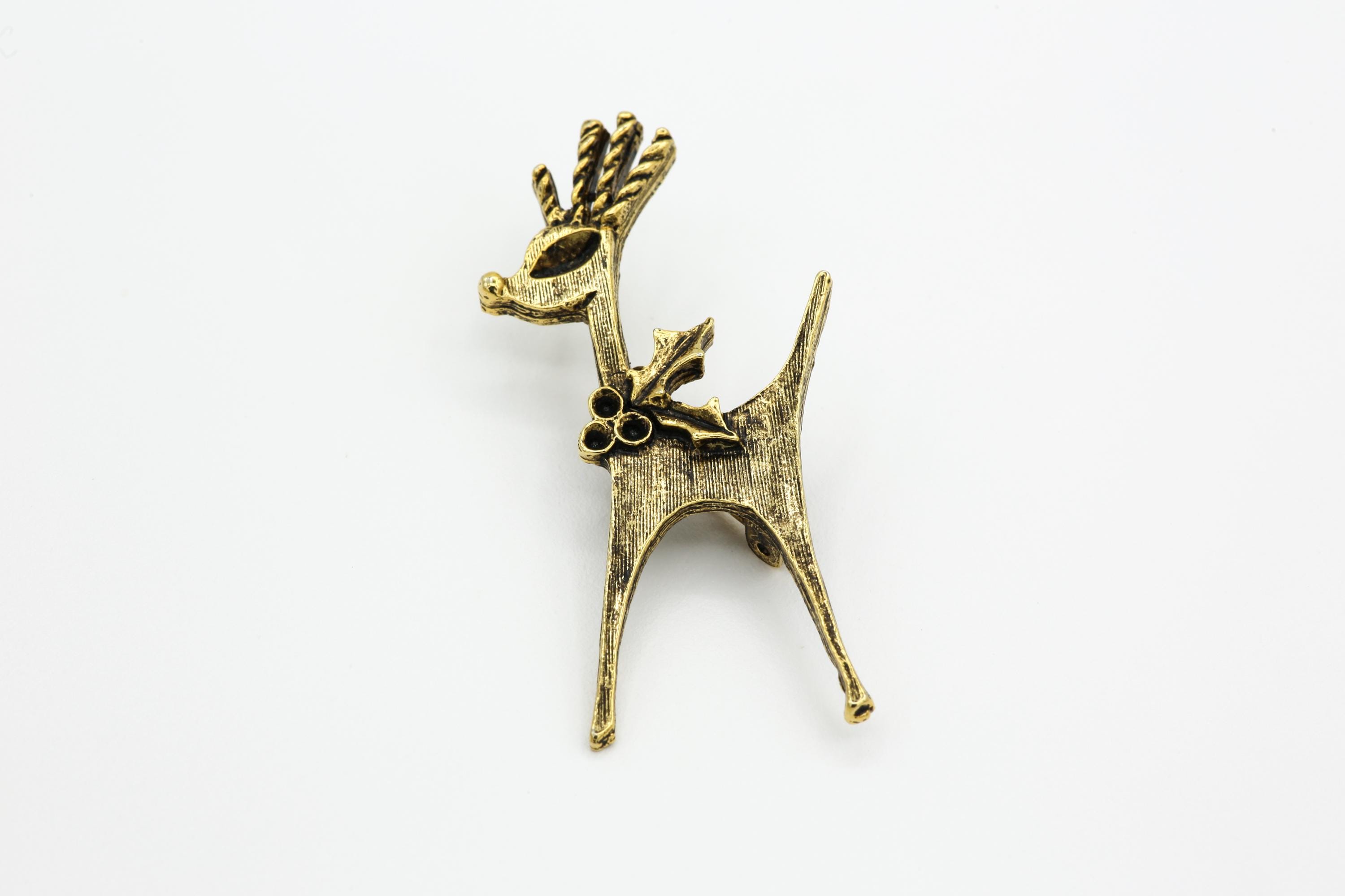 This gorgeous reindeer brooch has a classic mid-century modern design, and an antiqued gold tone finish.