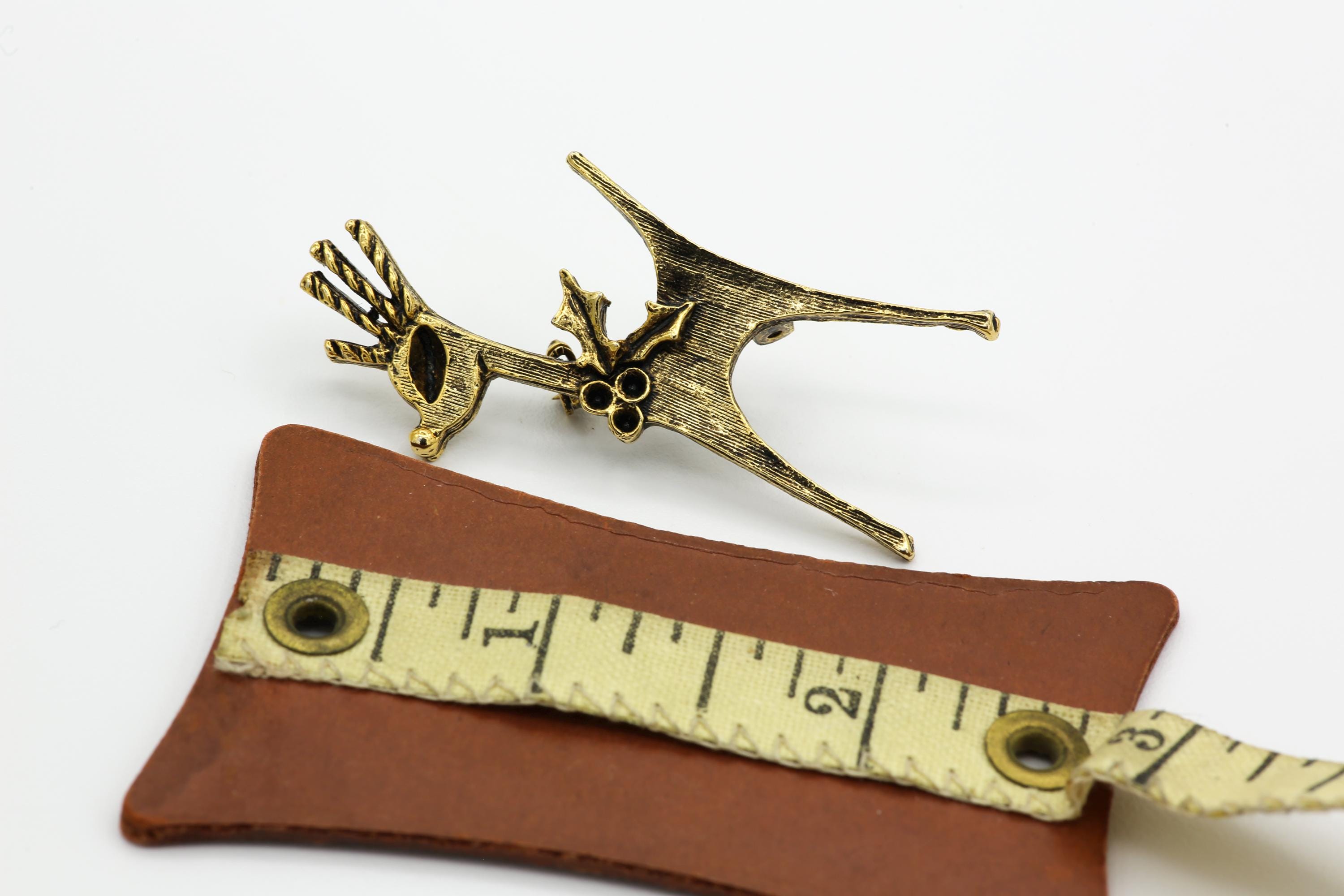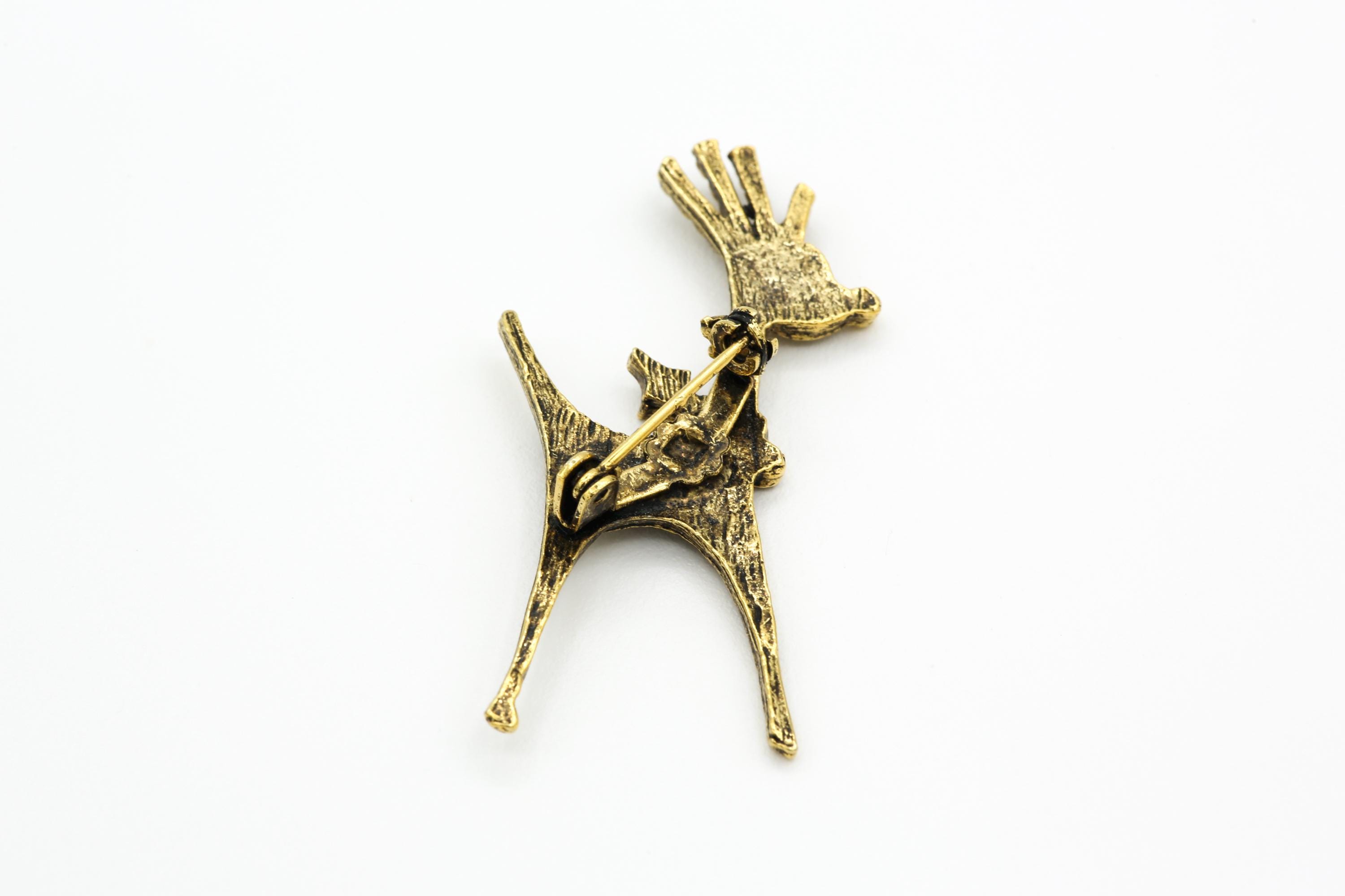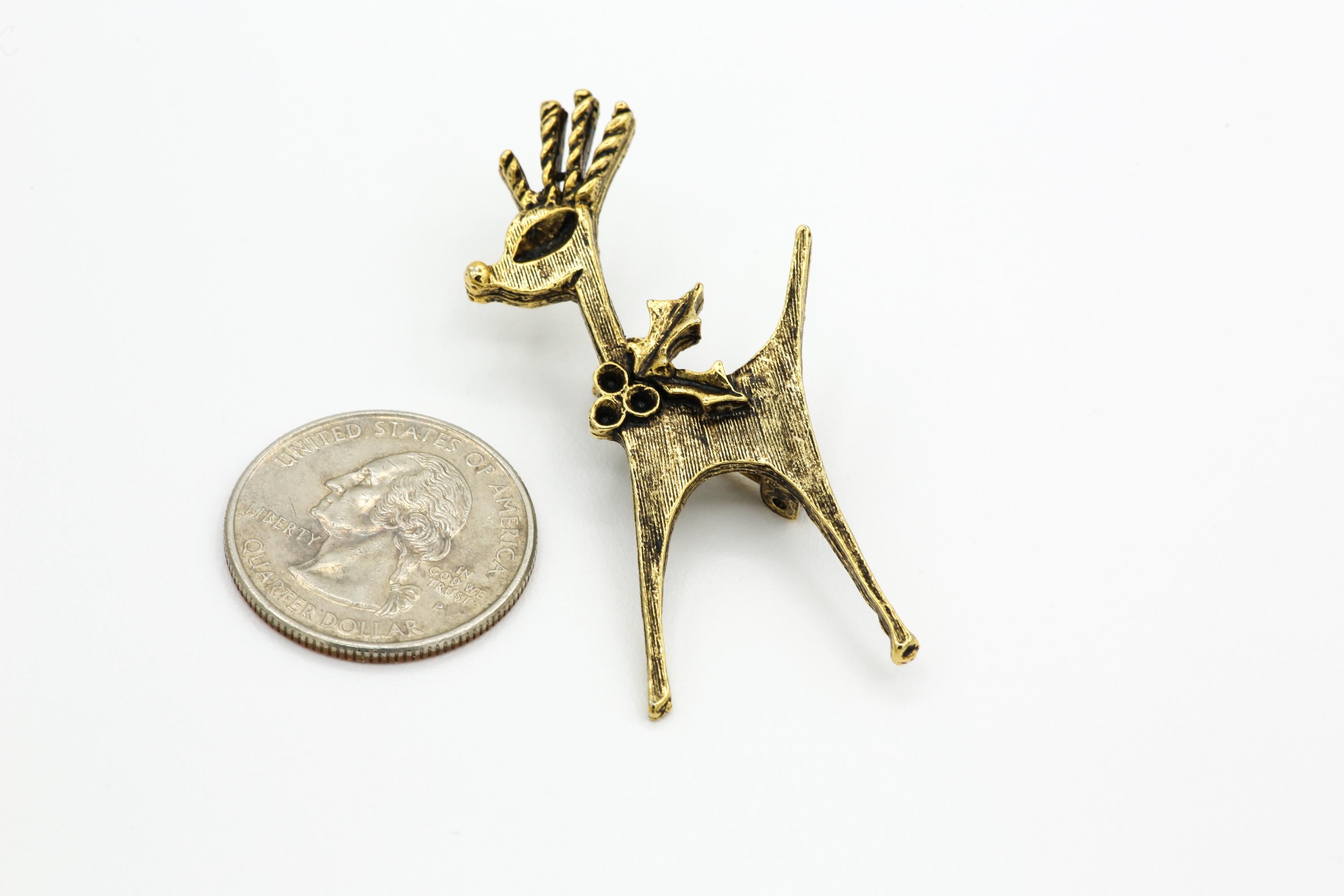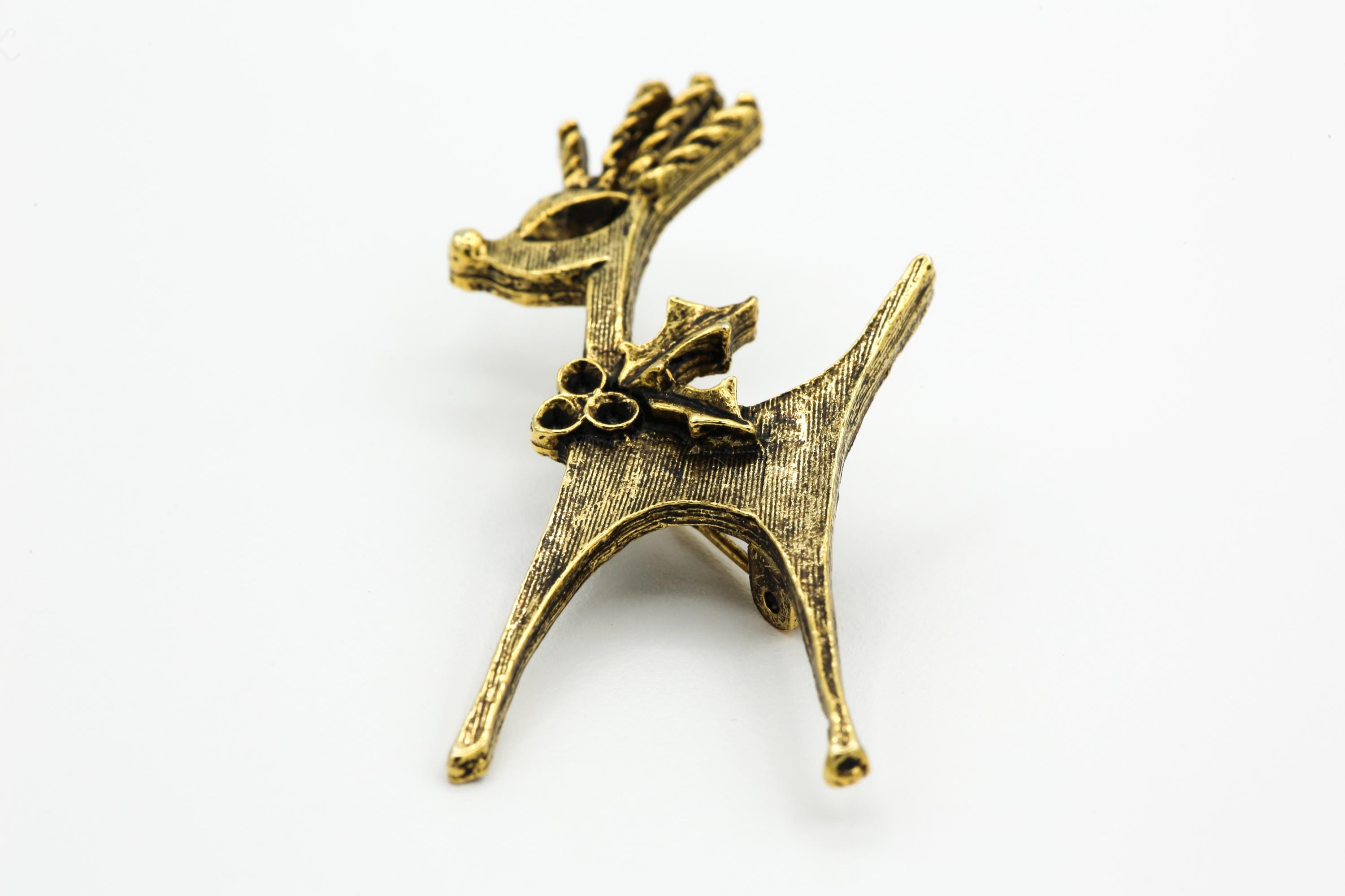 This gorgeous reindeer brooch has a classic mid-century modern design, and an antiqued gold tone finish.