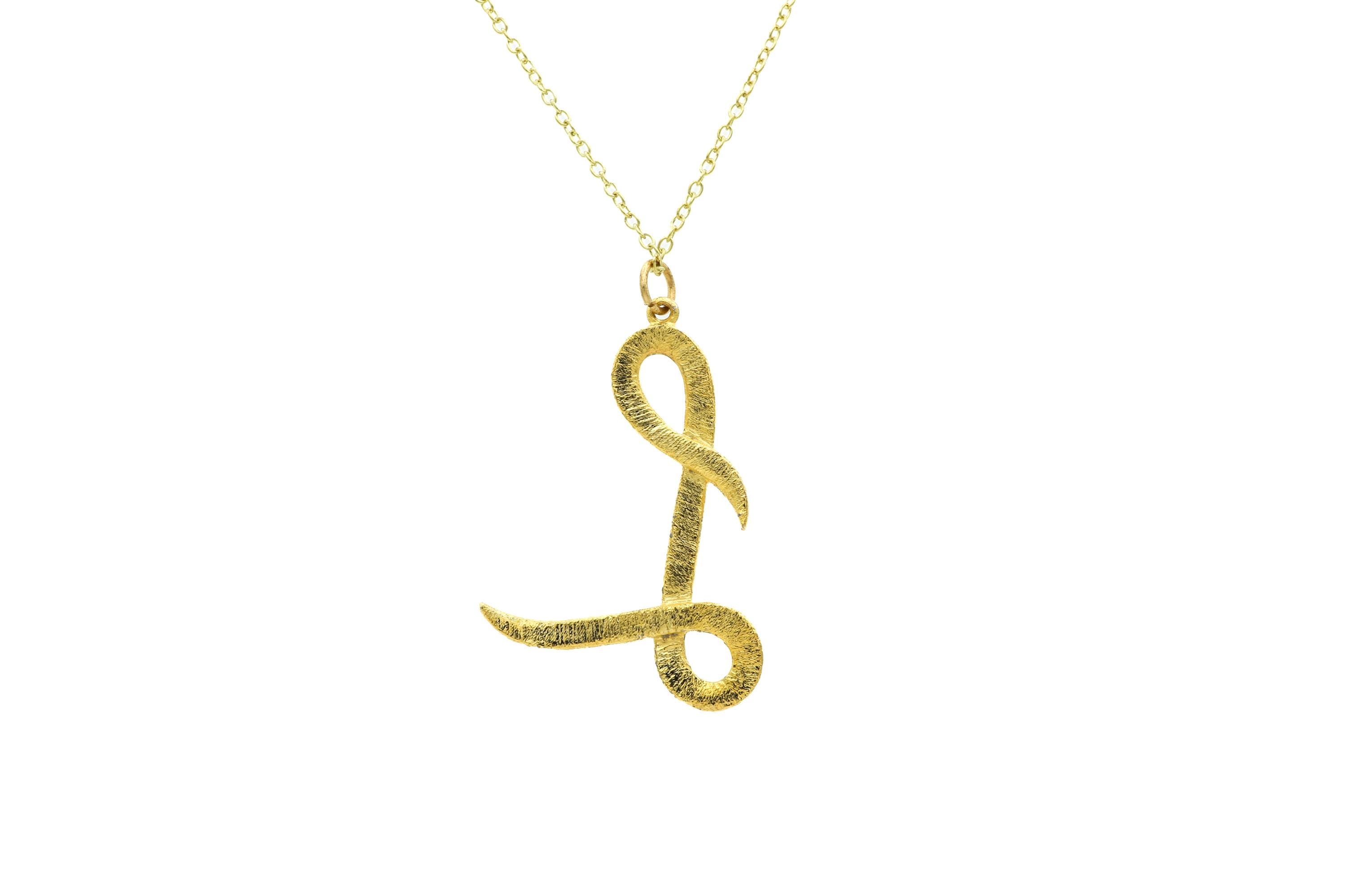 Big, beautiful letter "L" pendant necklace! This necklace is comprised of a very large (about 1-3/4") shiny gold tone vintage initial pendant and a vintage 18" gold tone chain. The pendant has a nice textured finish that appears to sparkle! Although these are new old stock, some areas of the letter might contain slight wear (check photos).