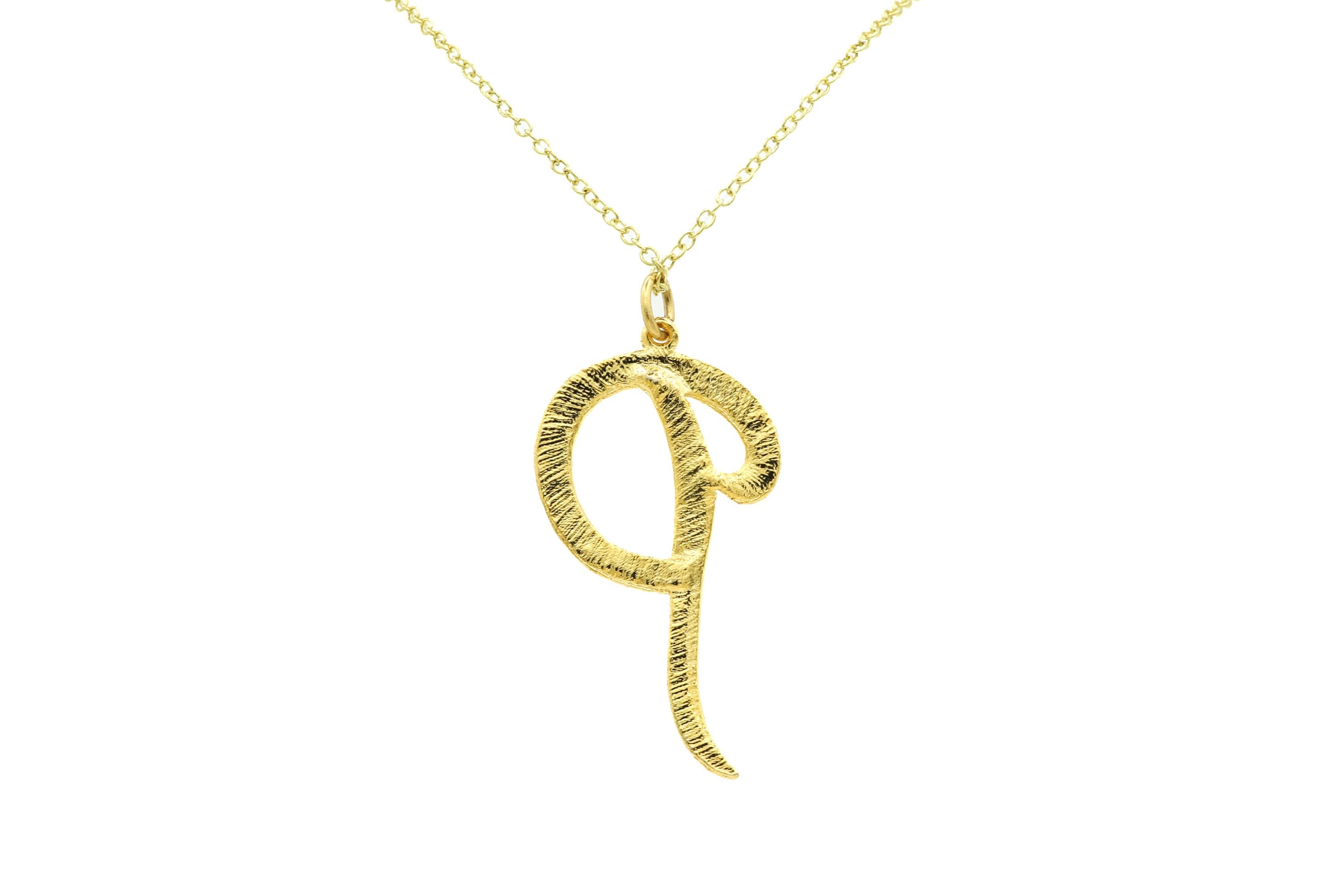 Big, beautiful letter "P" pendant necklace! This necklace is comprised of a very large (about 1-3/4") shiny gold tone vintage initial pendant and a vintage 18" gold tone chain. The pendant has a nice textured finish that appears to sparkle! Although these are new old stock, some areas of the letter might contain slight wear (check photos).