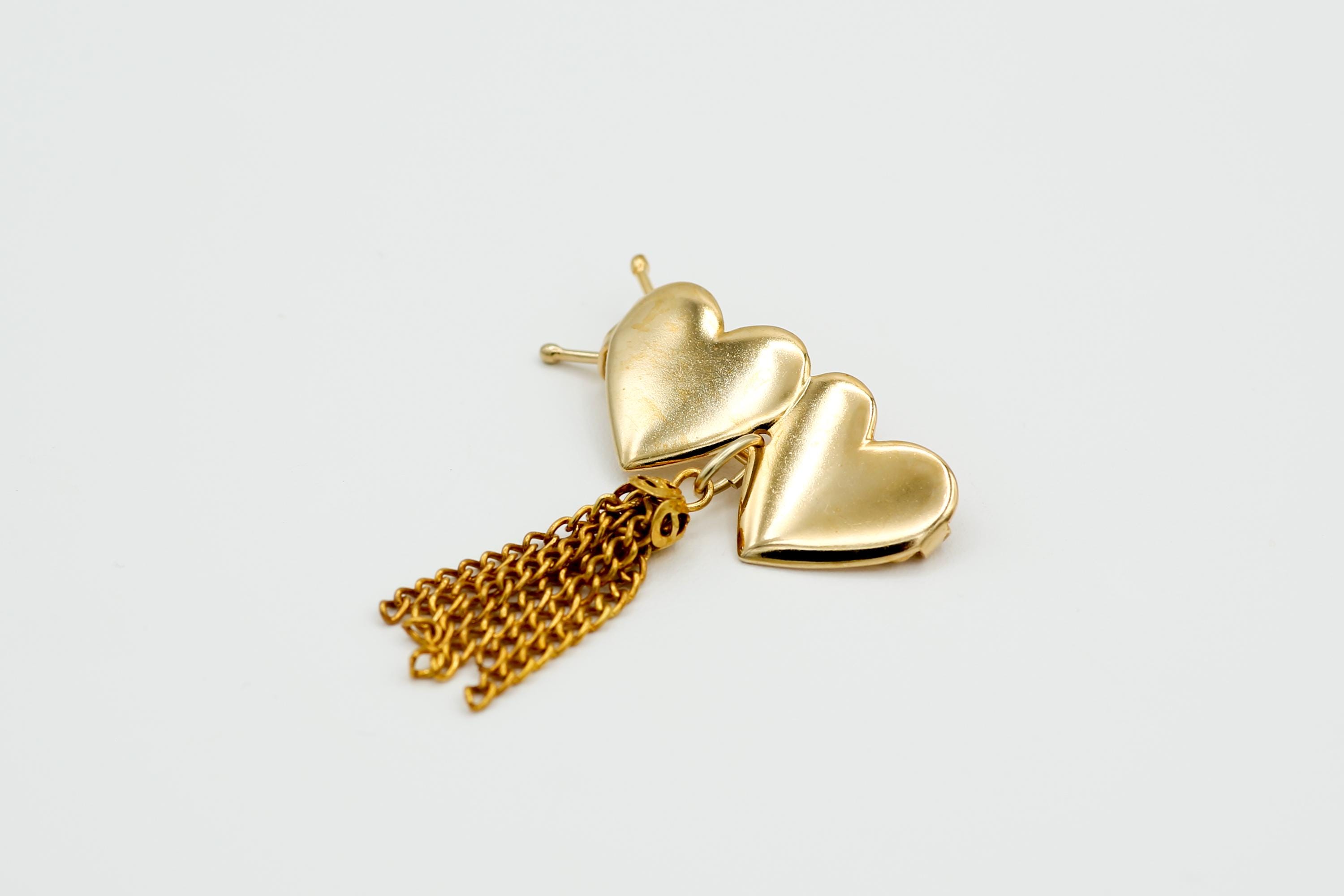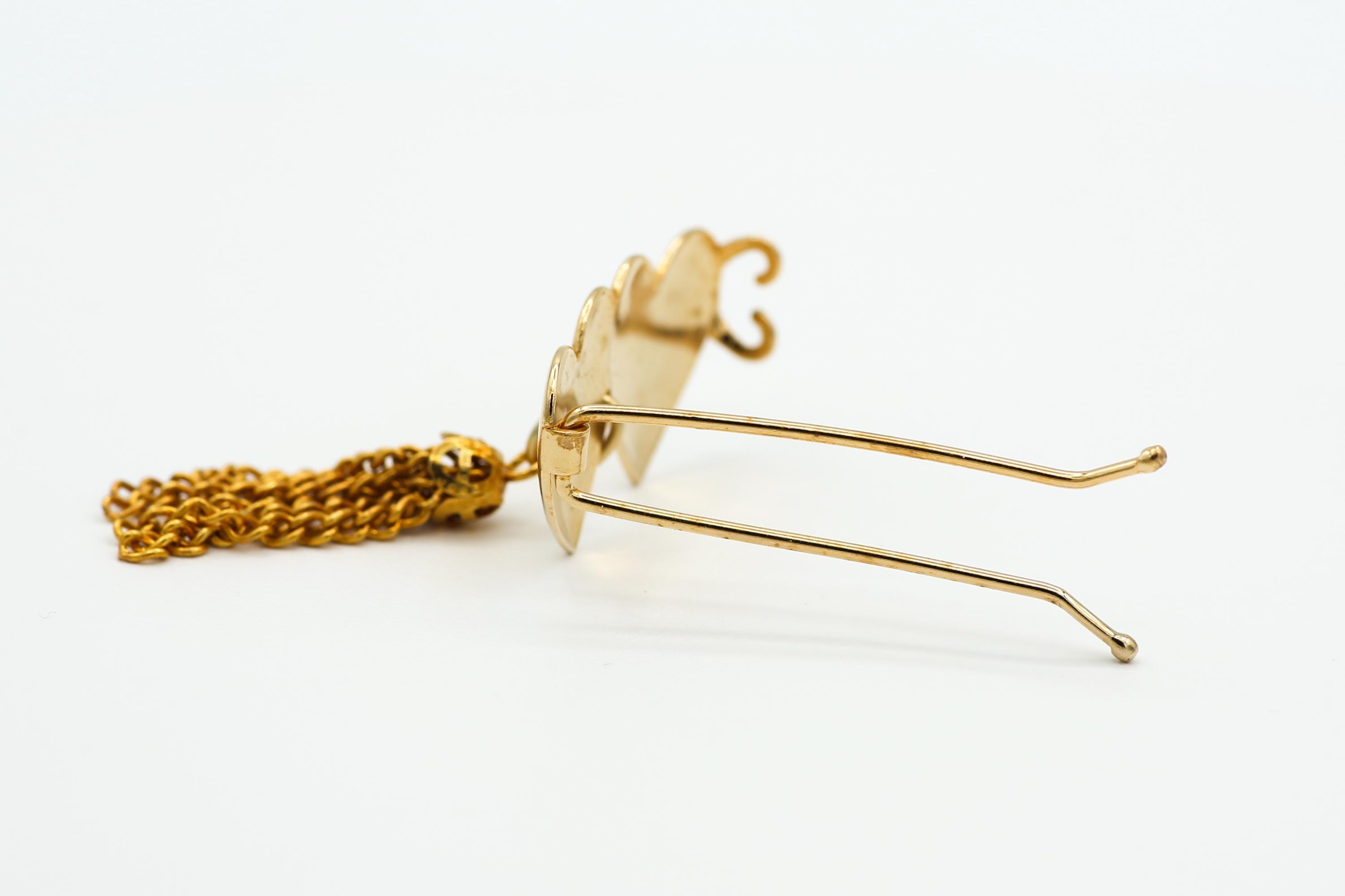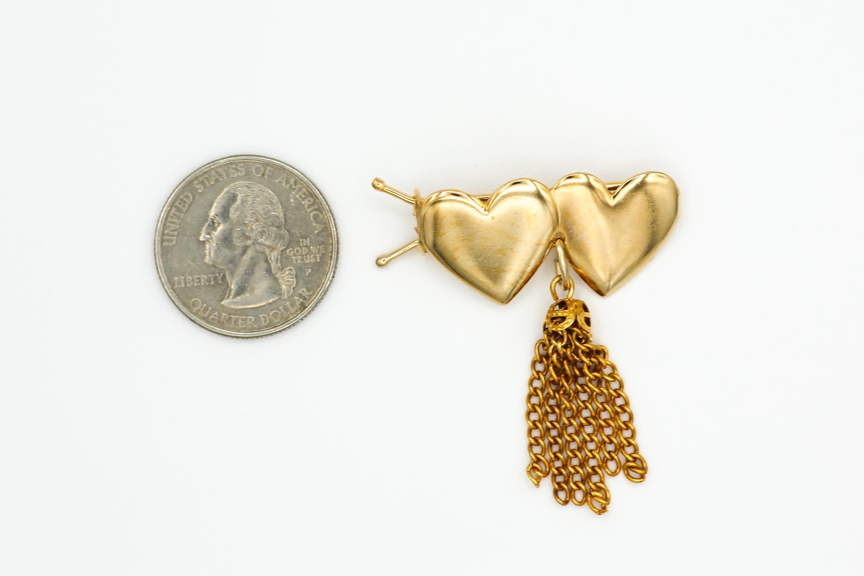 Vintage Gold Tone Double Heart Barrette With Tassel: NOS Hair Clip Accessory.