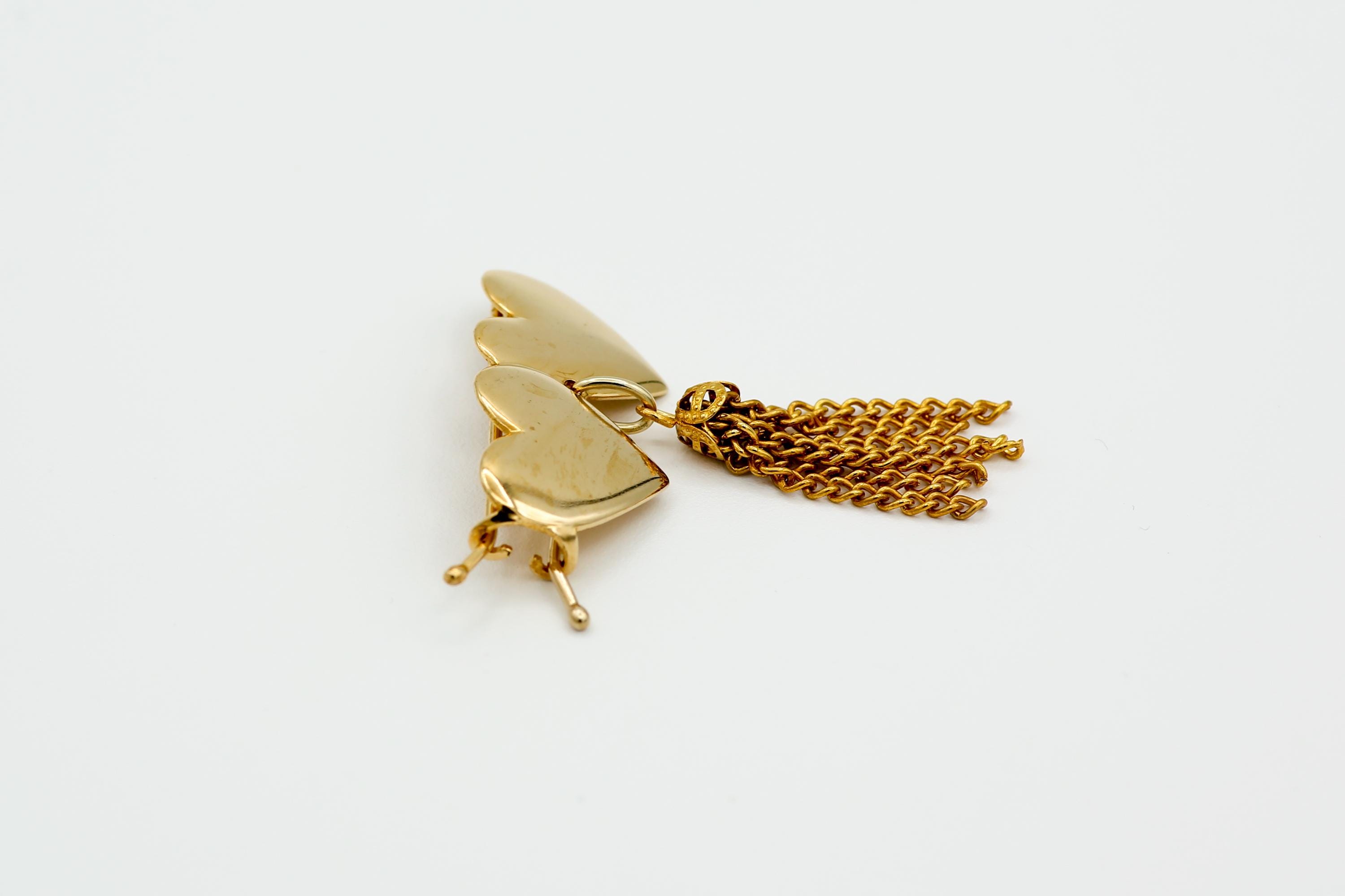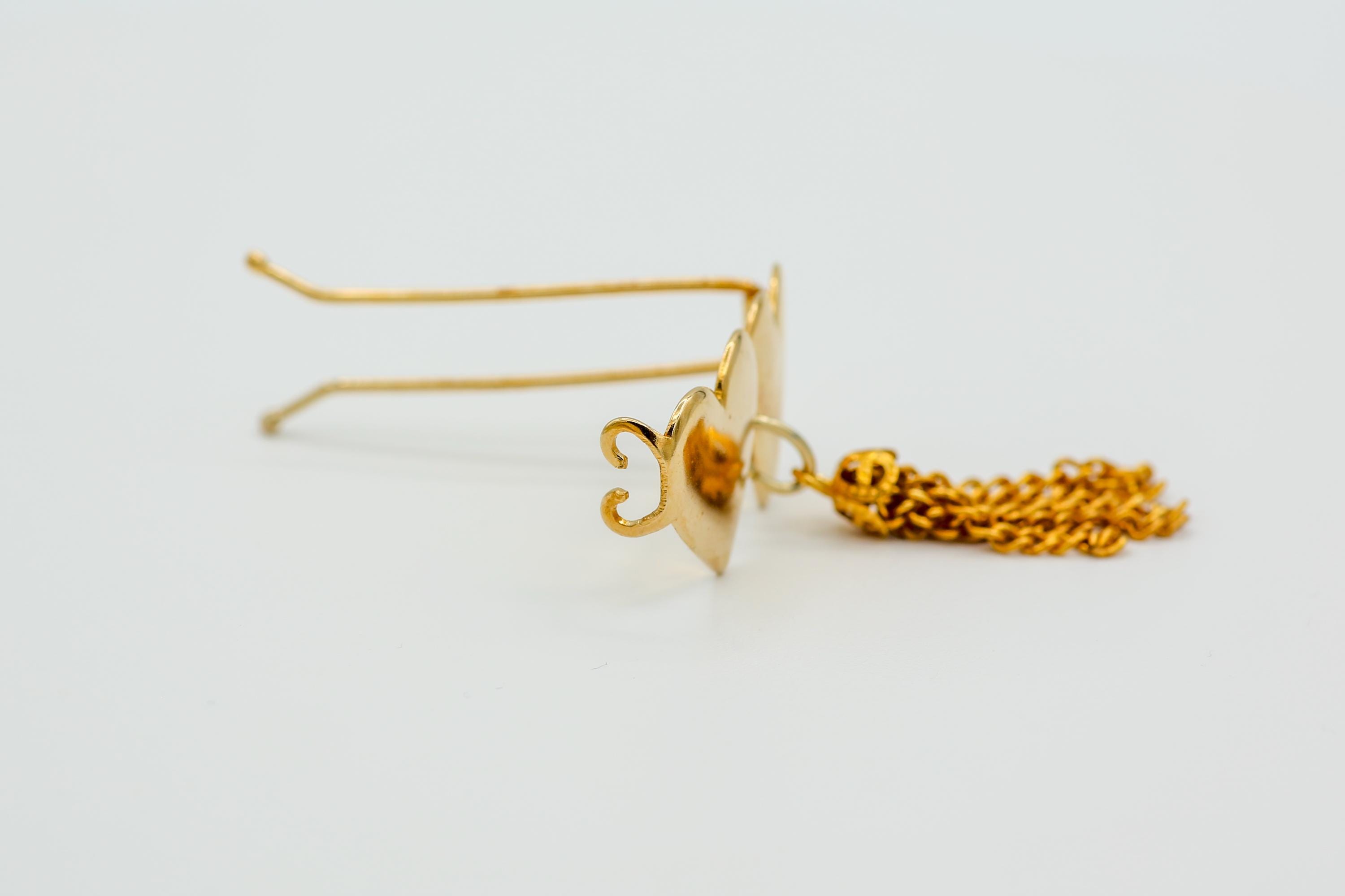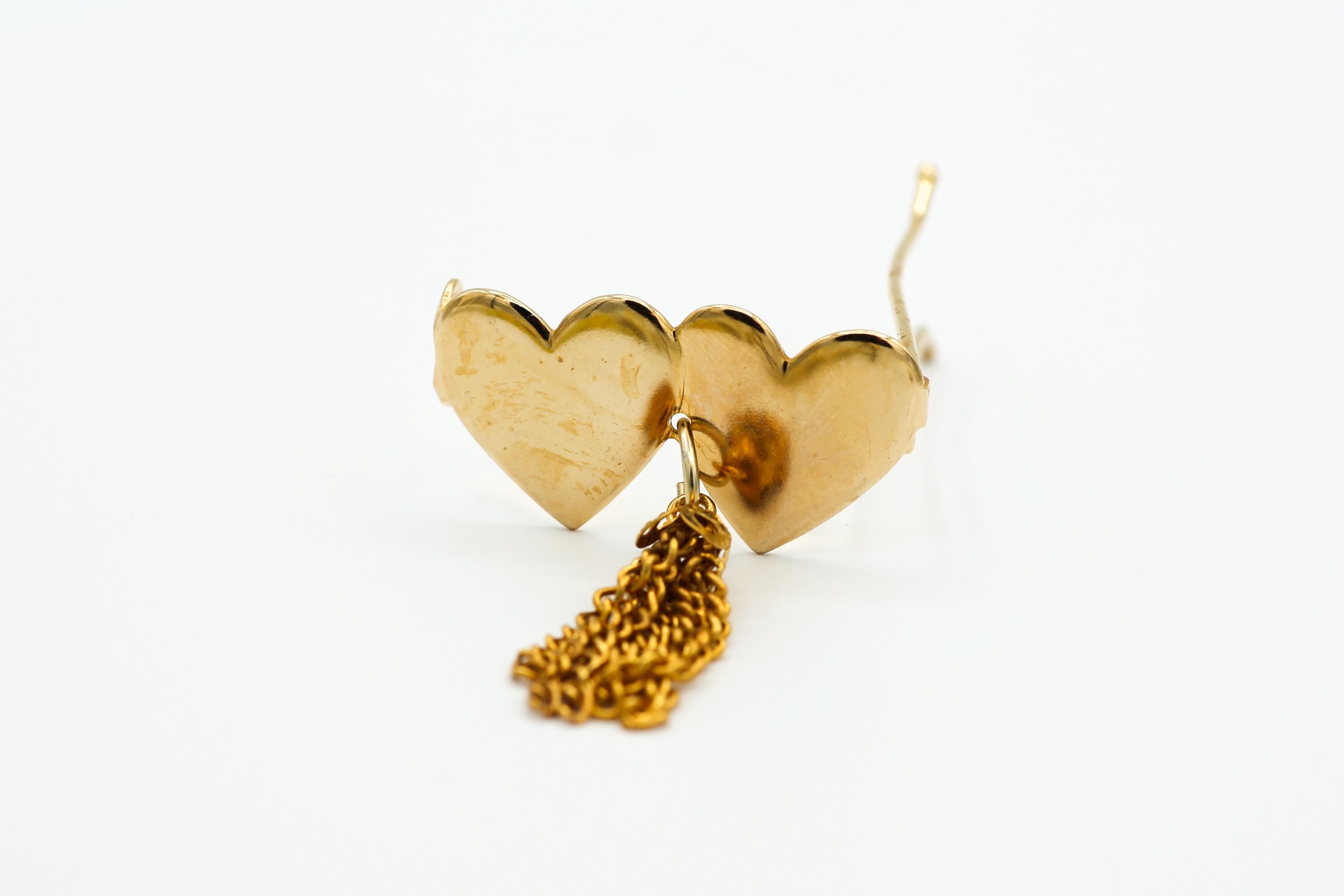 Featured here is a shiny gold tone metal barrette with 2 connected hearts and a tassel. It is vintage unsold stock and measures about 1.5" x .75" with the tassel measuring about 1.25" long.