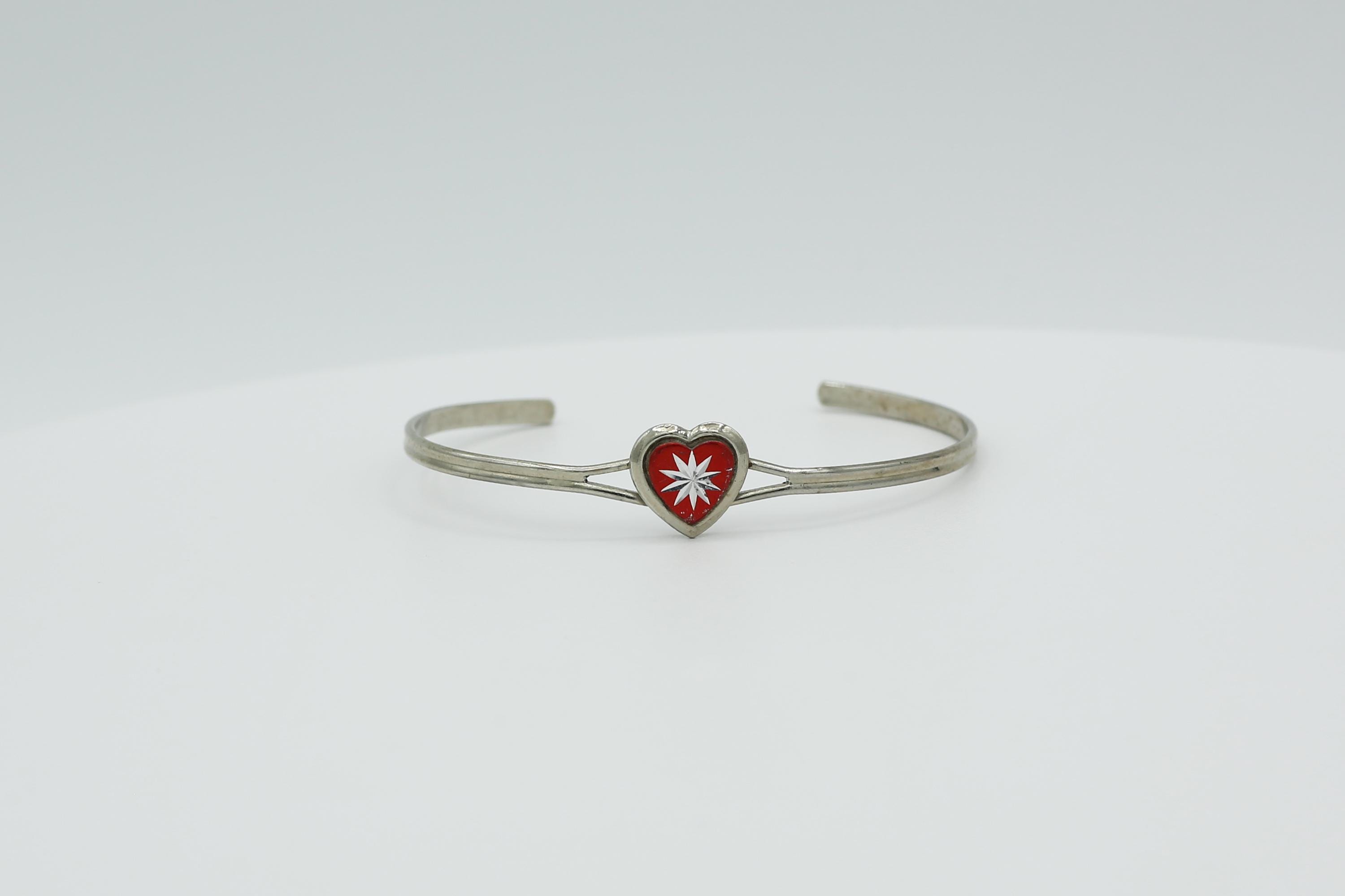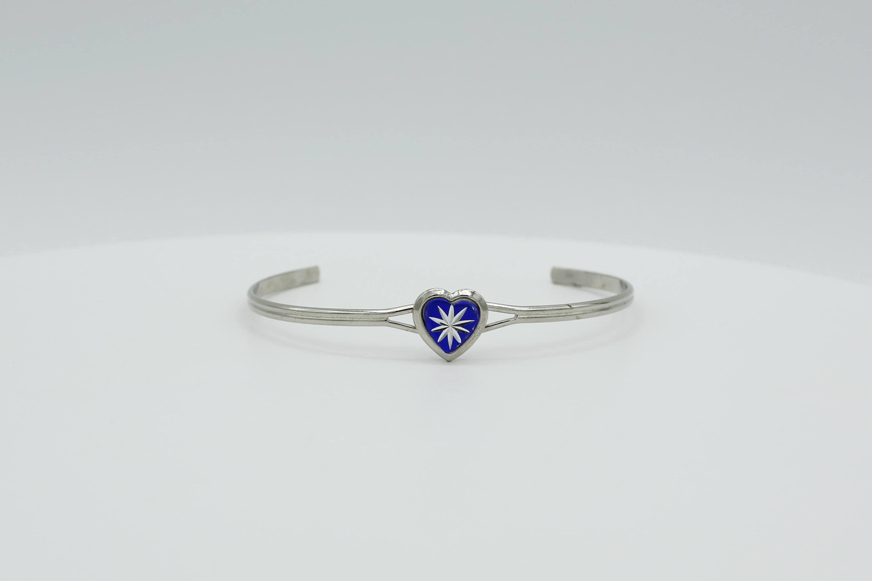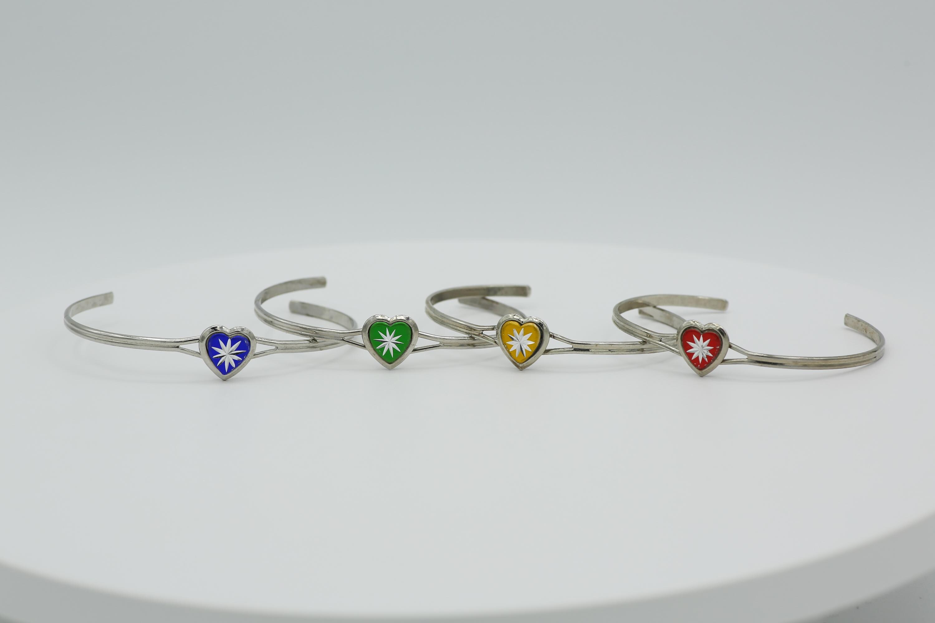 Vintage Silver Tone Heart Cuff Bracelet: Tiny Starburst Bangle in Blue, Green, Red or Yellow.