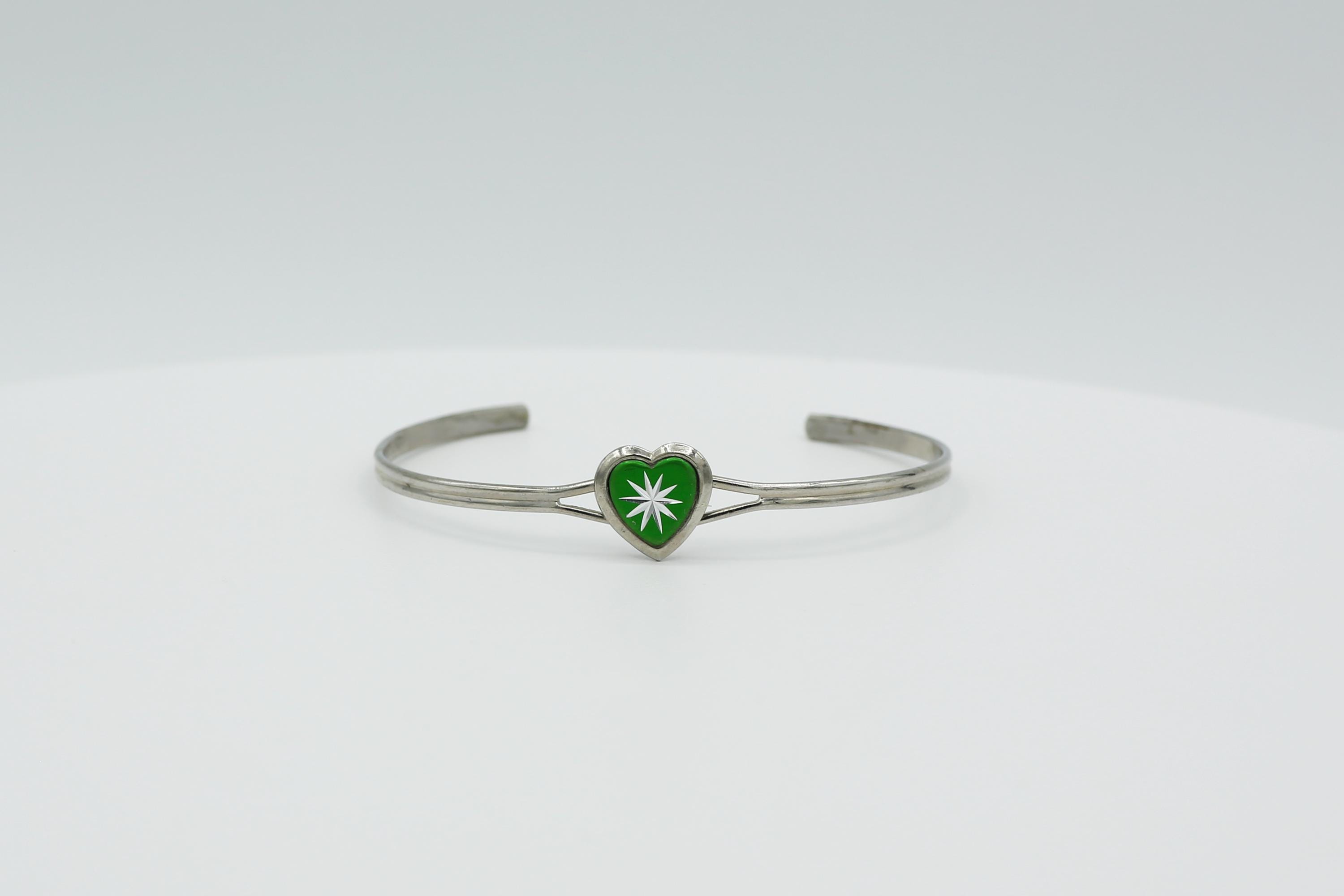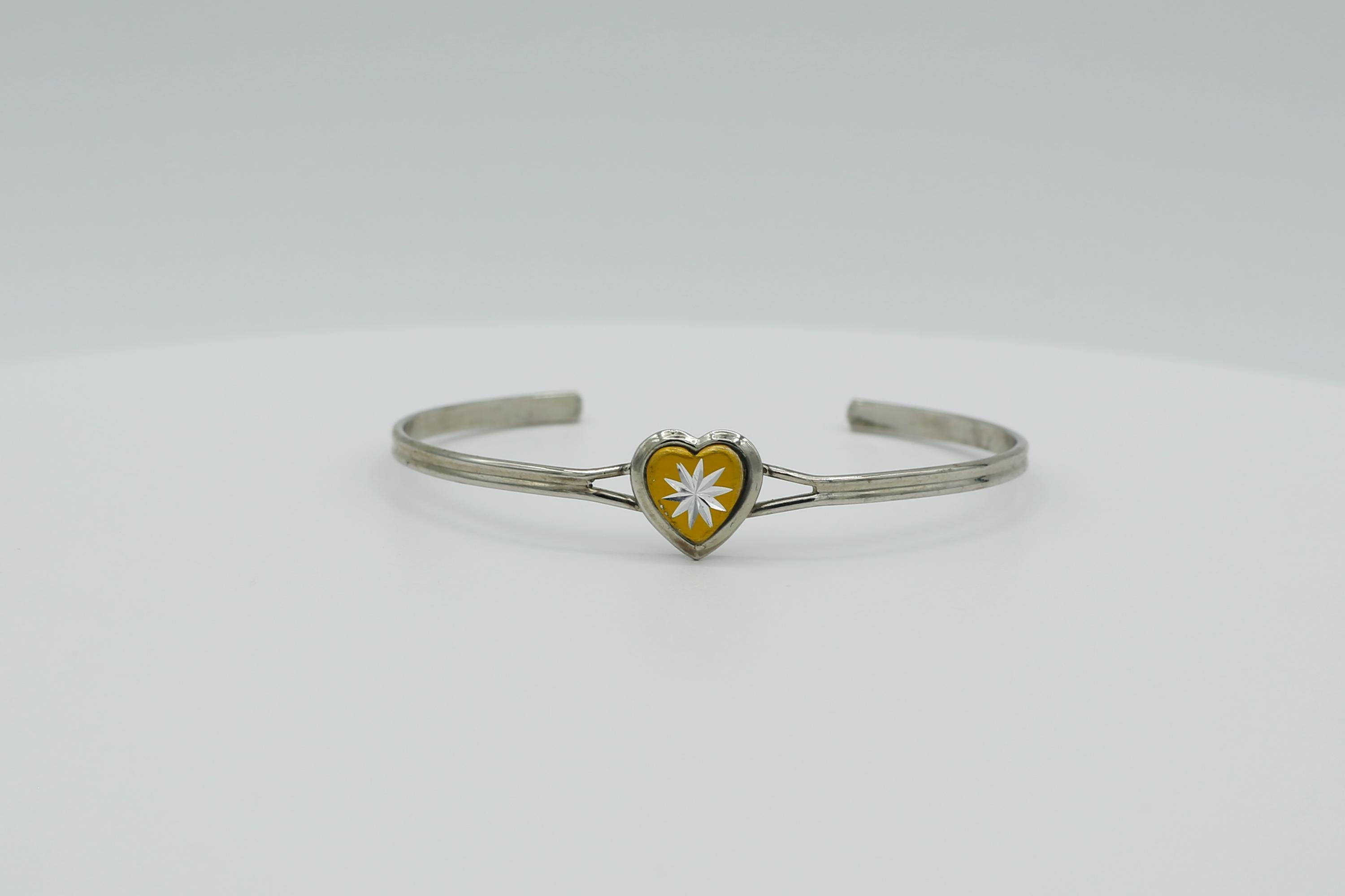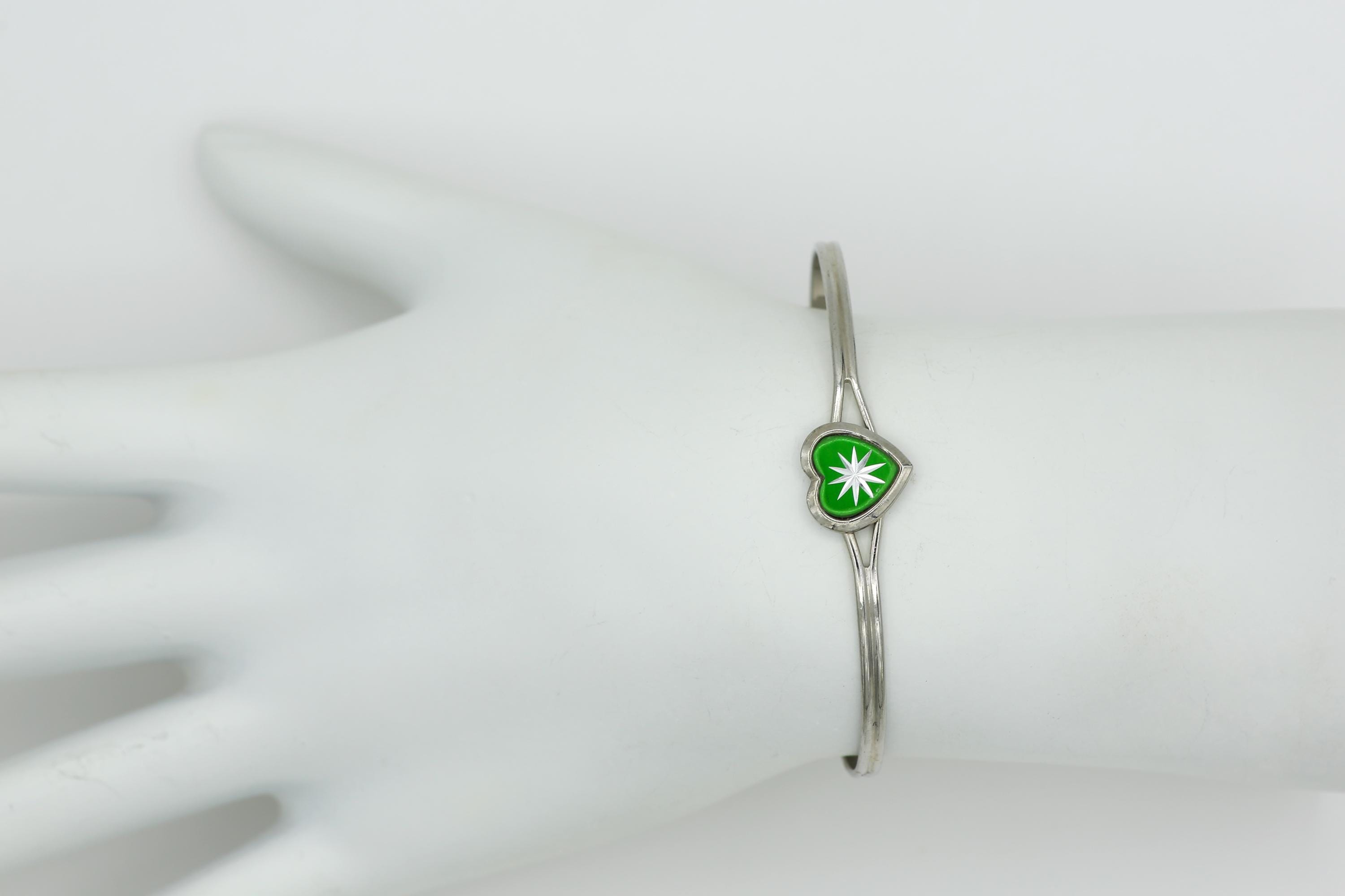 Vintage Silver Tone Heart Cuff Bracelet: Tiny Starburst Bangle in Blue, Green, Red or Yellow.