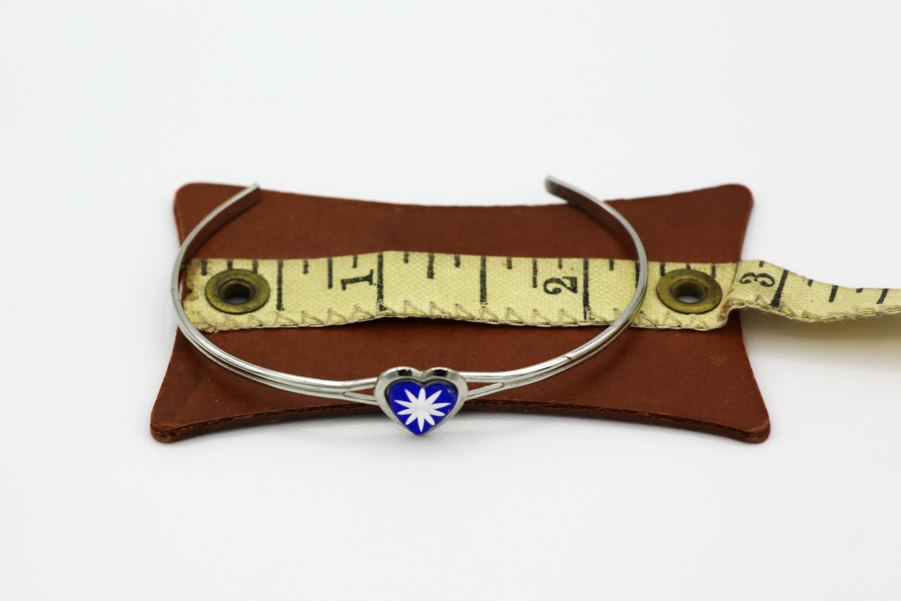 Featured here are adorable tiny silver tone metal cuff bracelets, each has a small heart with a starburst in the center. They come in your choice of Blue, Green, Red, or Yellow. The bracelets measure about 2"-2.25" wide and about 1.5" front to back. Although they can be adjusted slightly, they will fit a small wrist best.