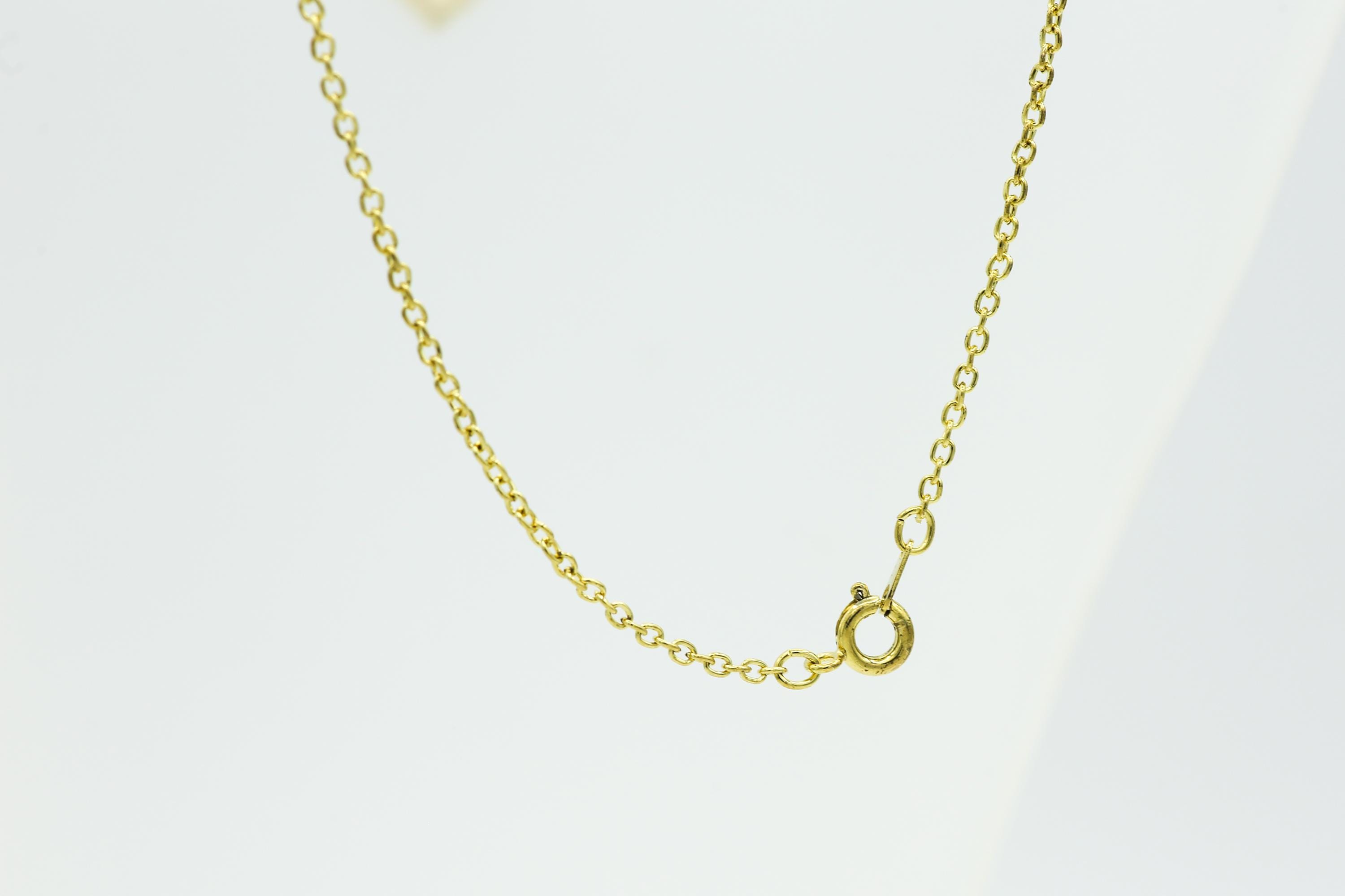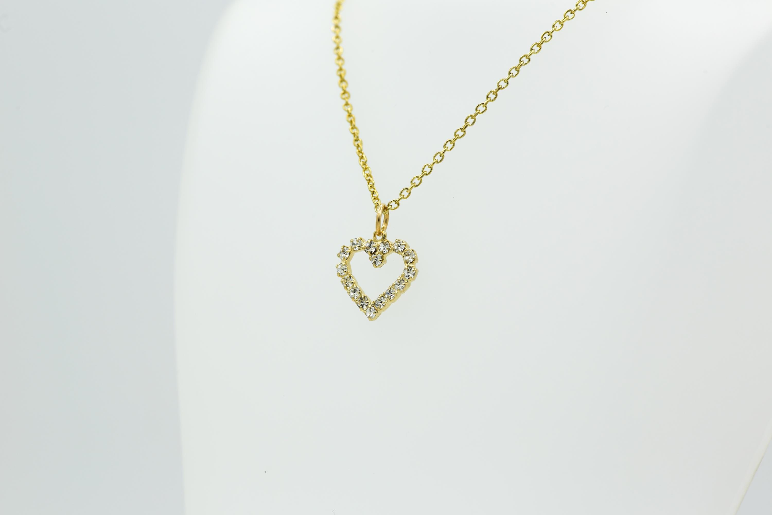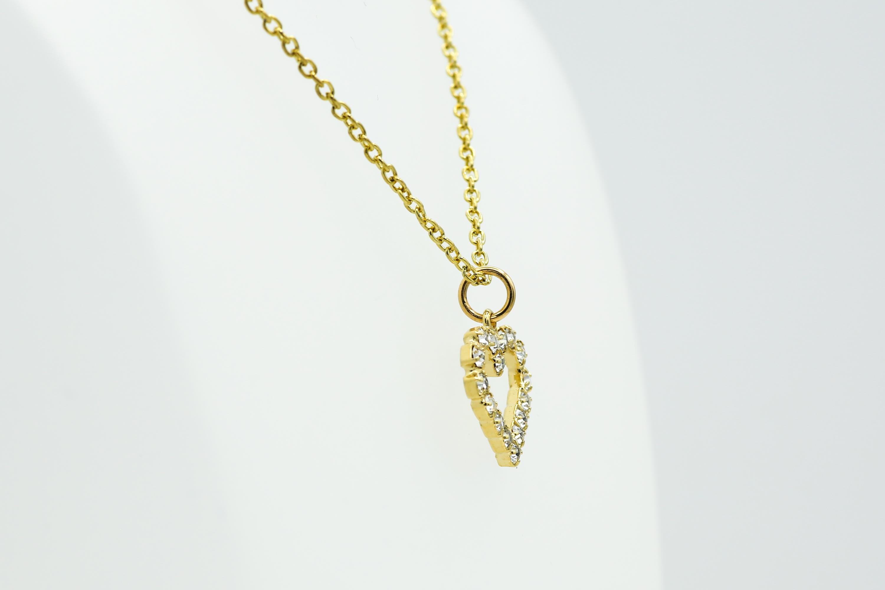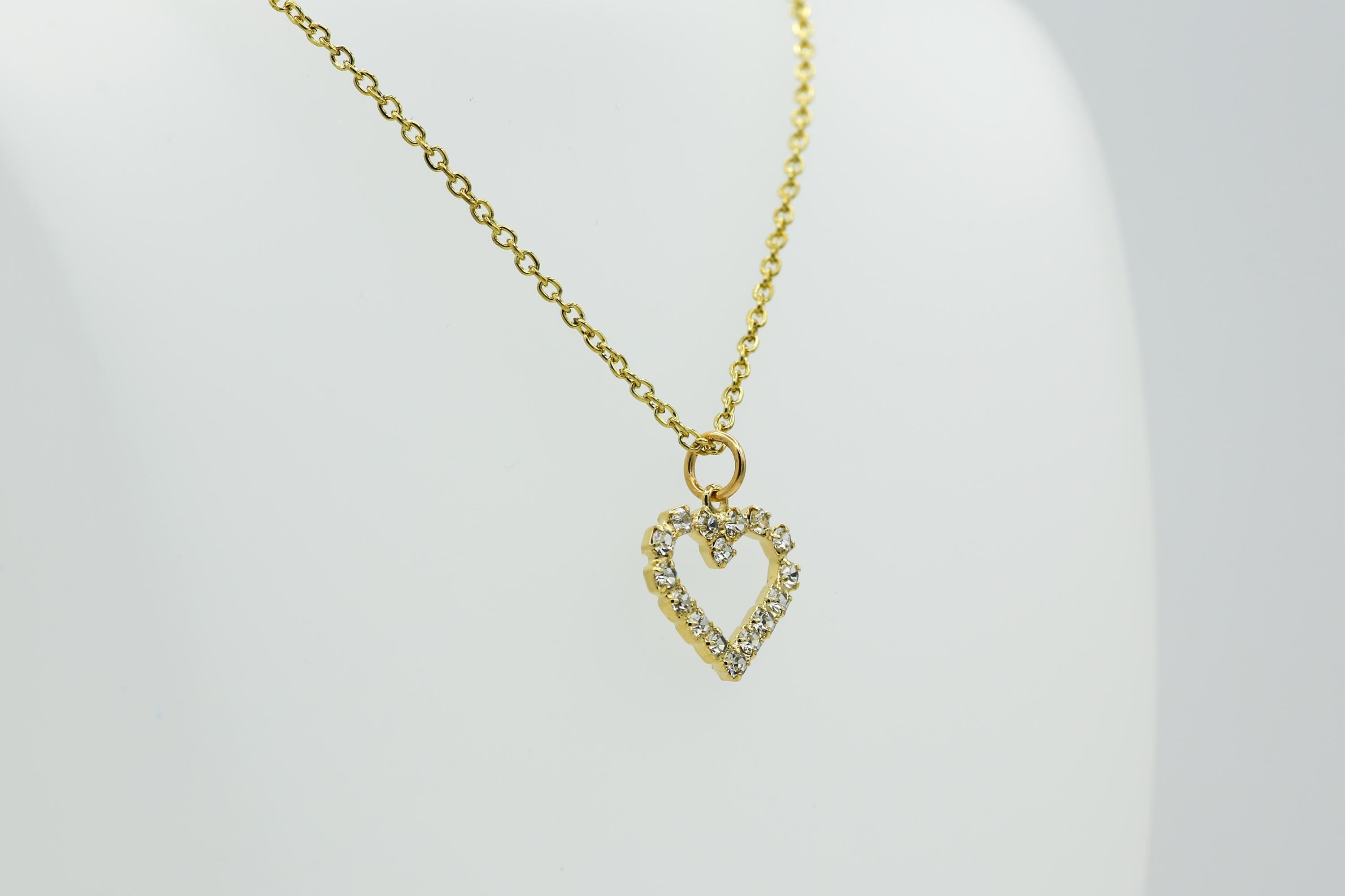 Pictures don't do this necklace justice! It is so sparkly with a gold tone chain and rhinestone outlined hart pendant. The chain is about 18" long and the pendant is about 16.5mm in both length and width.