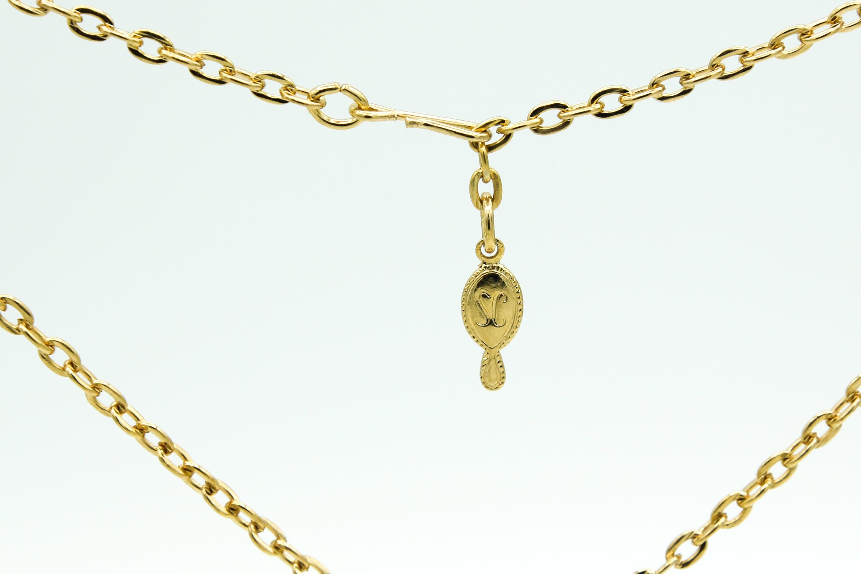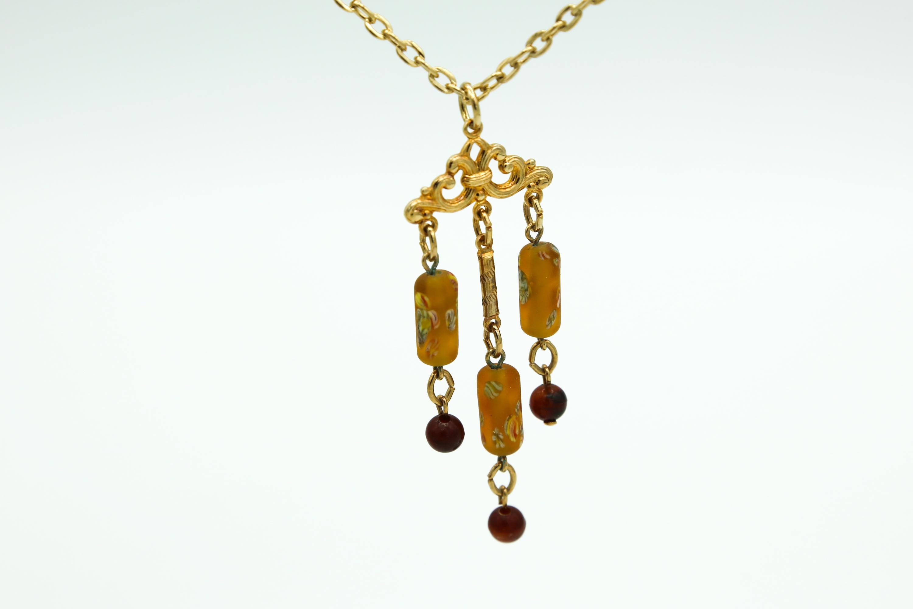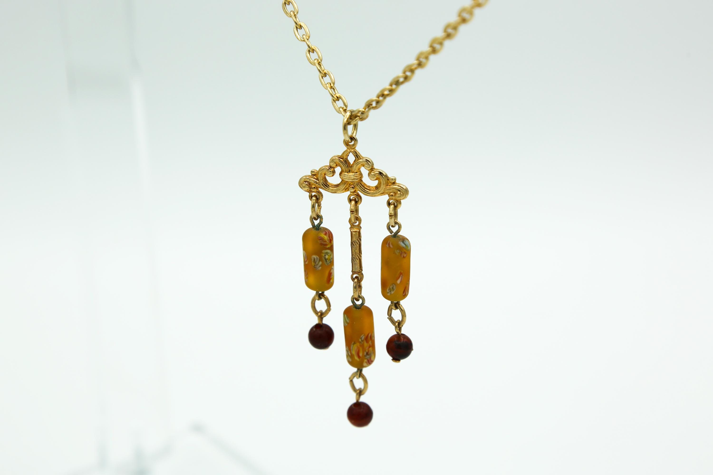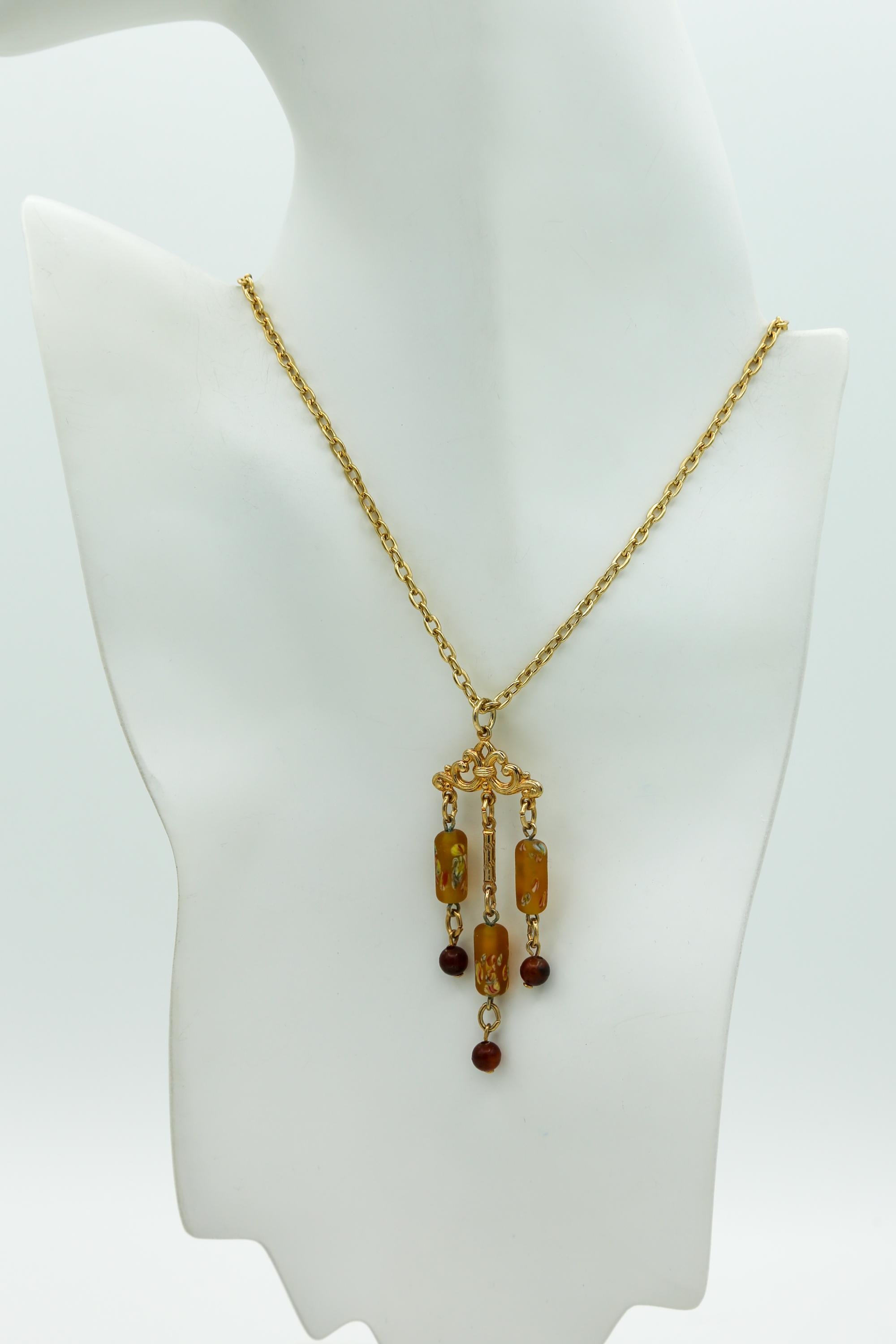 Necklace is 24" long with a hook clasp, and the Sarah Coventry 'SC' tag on the gold tone chain. The pendant/tassel style drop measures about 3" long.