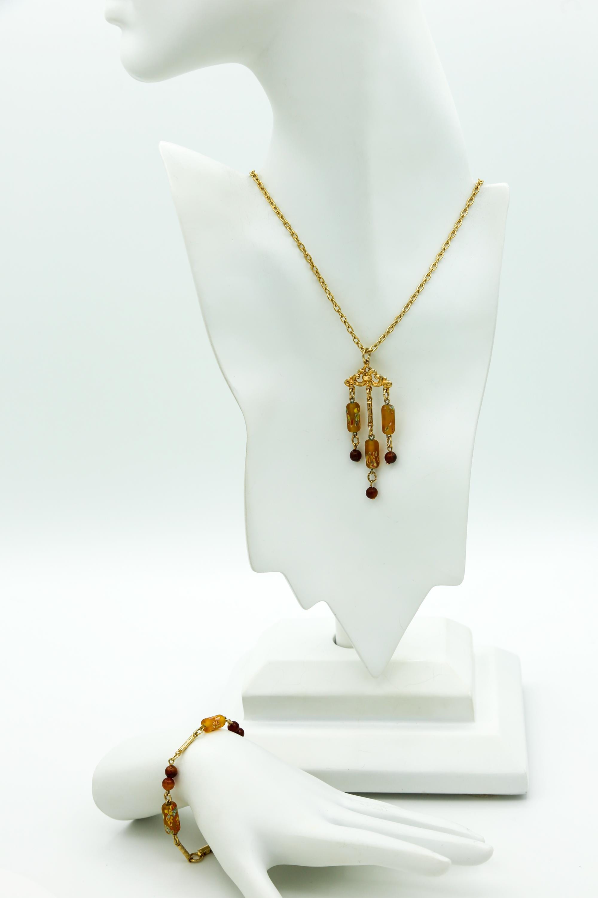 All pieces contain beautiful beads with flowers painted on them, and smaller, round beads with a swirly design and a brownish color.