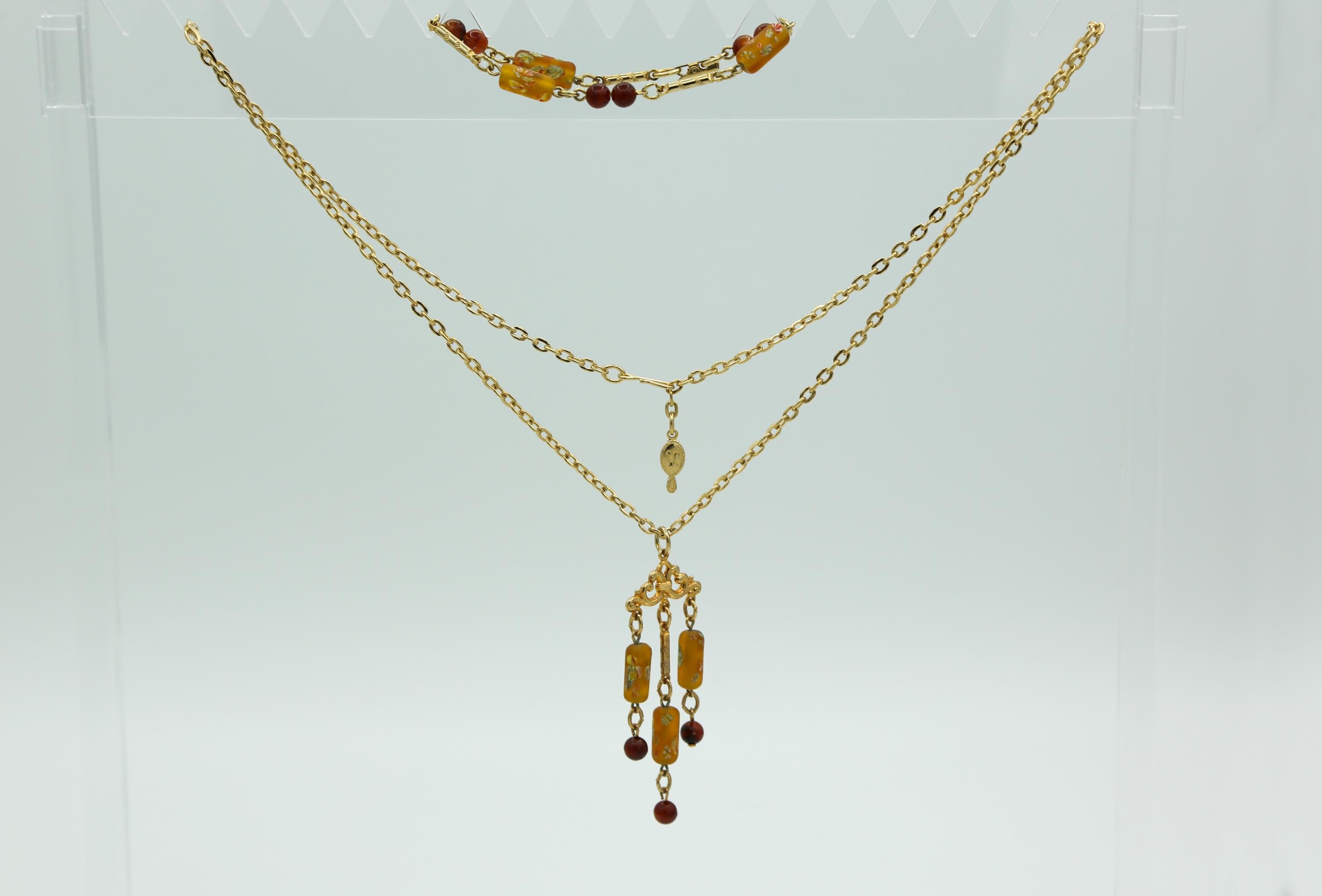 Necklace is 24" long with a hook clasp, and the Sarah Coventry 'SC' tag on the gold tone chain. The pendant/tassel style drop measures about 3" long.