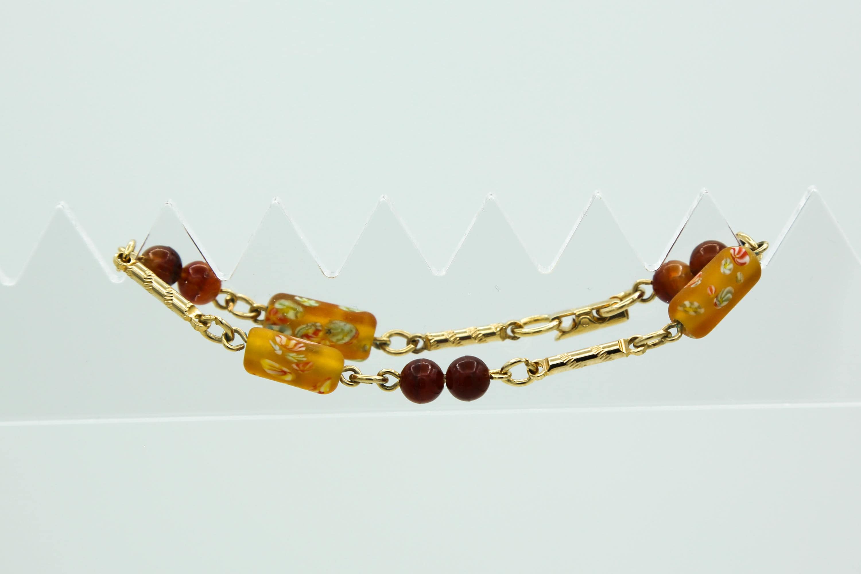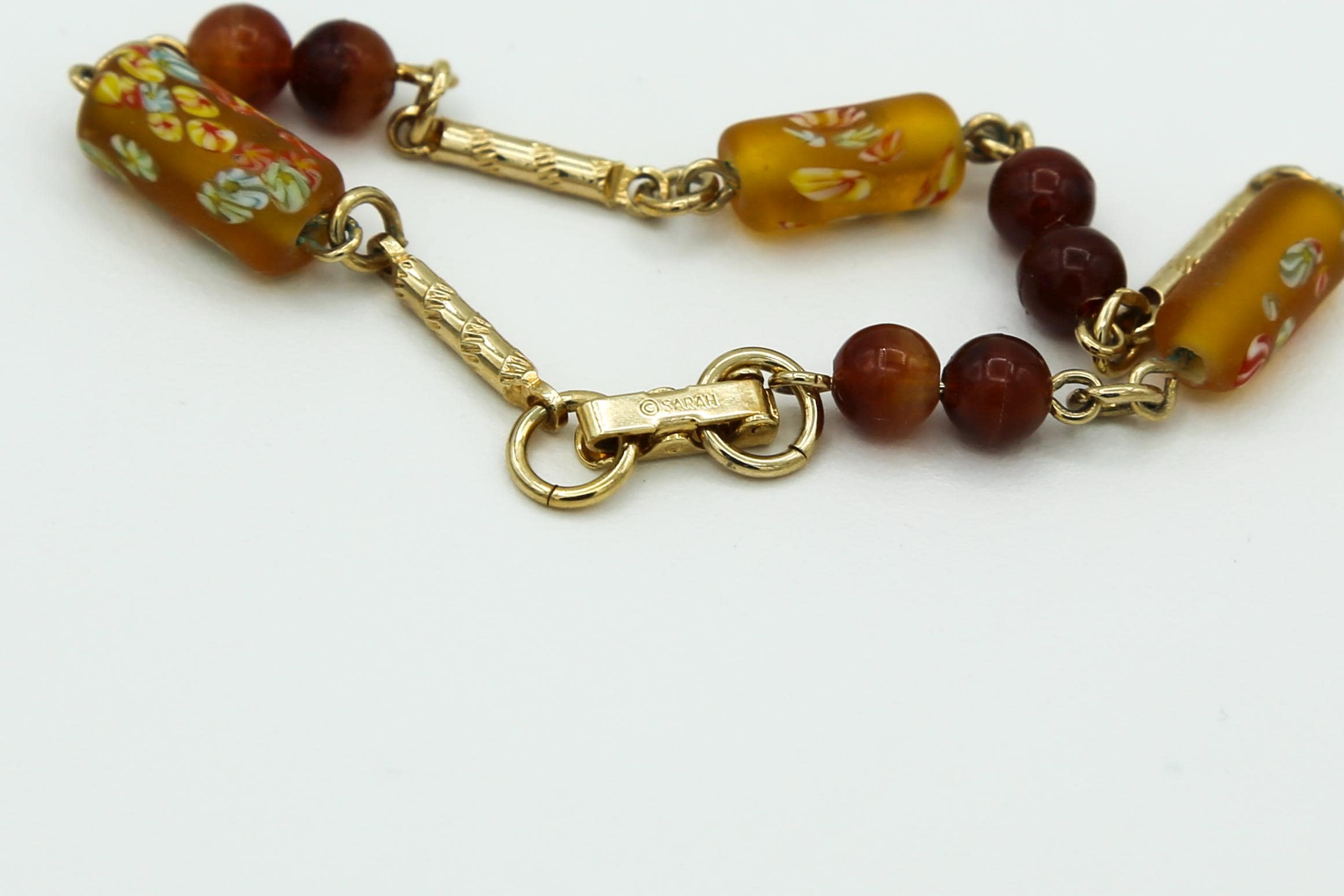 The bracelet measures about 7.5" long and has a fold over clasp with "SARAH" stamped on it. It contains the same kind of beads as the necklace with additional gold tone bars between them.