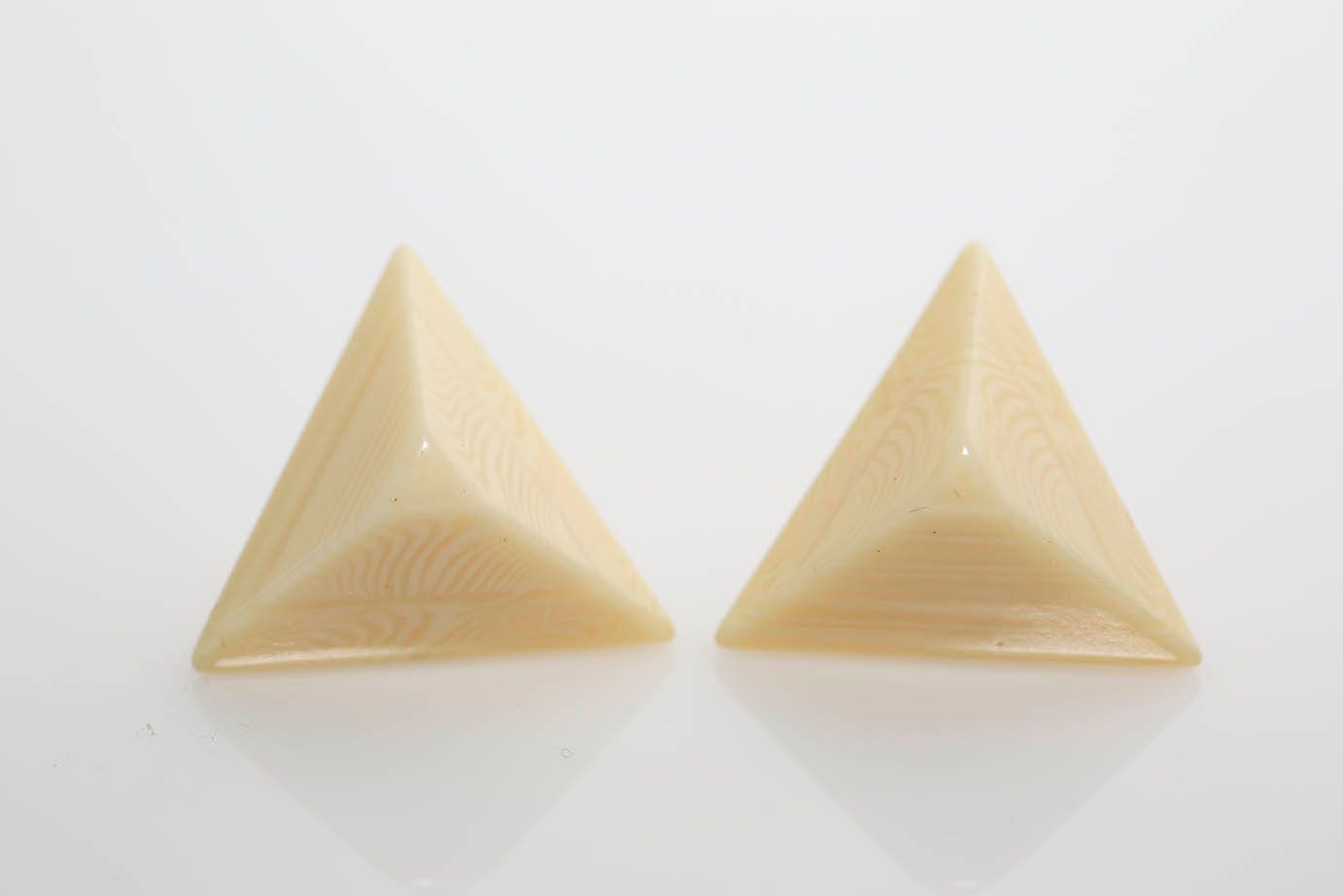 These pierced earrings are vintage dead-stock and feature off-white swirled Lucite pyramids, which measure about 1" and have centered posts. Each Pair is slightly different in their pointiness. Some have a more flattened tip, while others are more pointed.