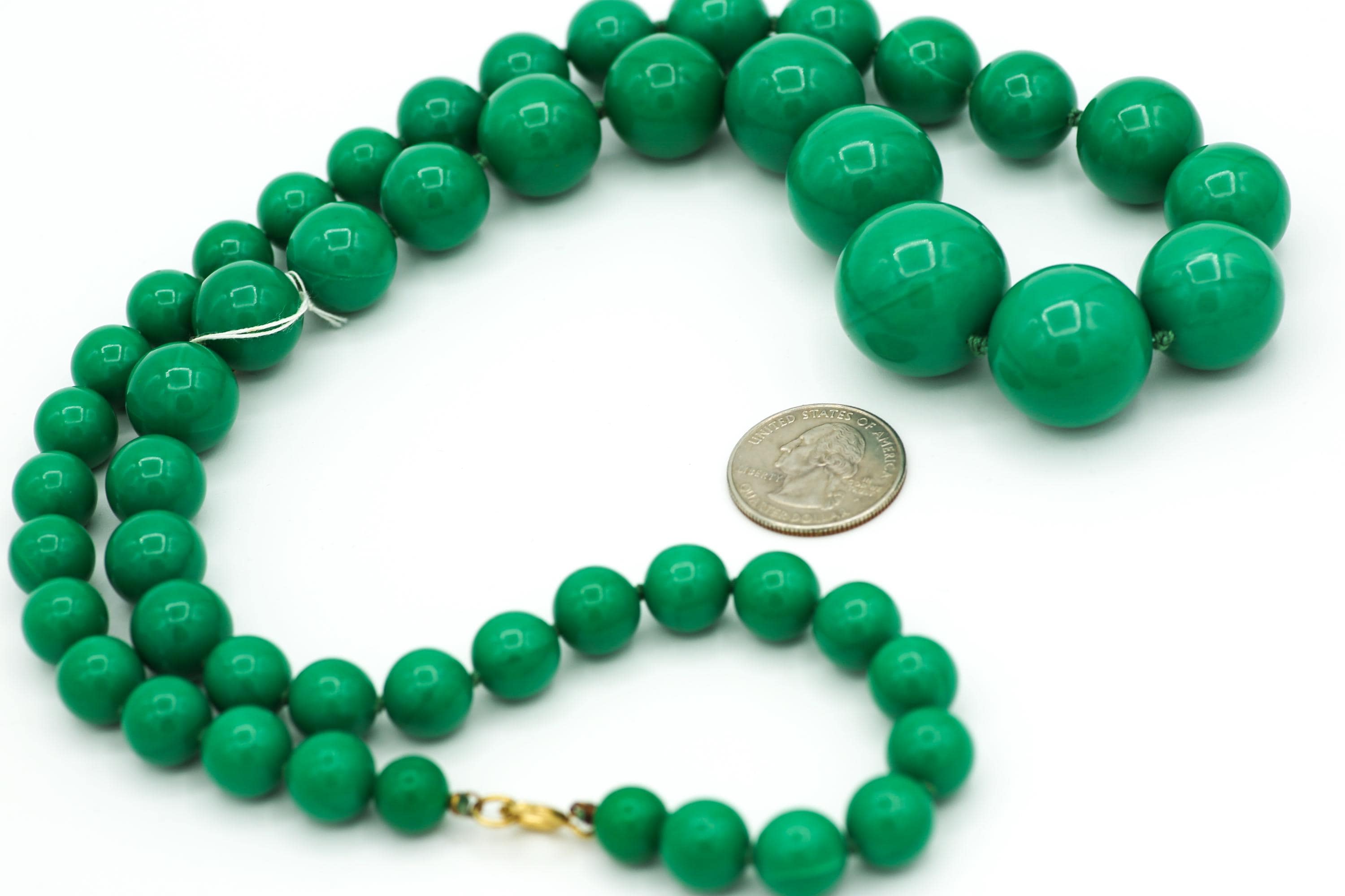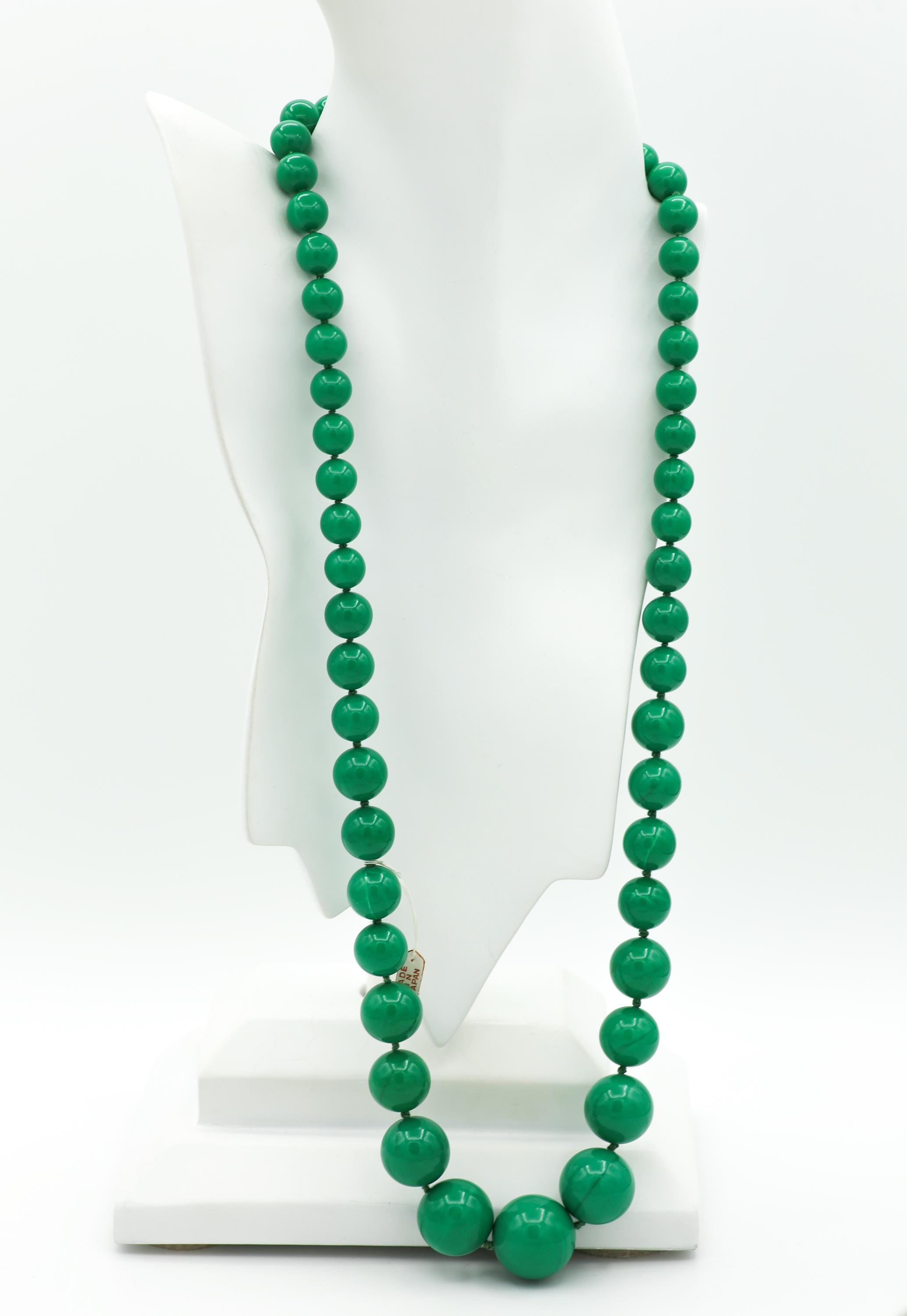 Featured here is a long (30") green necklace with graduating size beads individually knotted between each. Most of them still have their original "Made in Japan" tags. The beads consist of 7 sizes, starting with 10mm (smallest beads near the clasp) all the way up to 24mm (largest bead in the center). They have a slight marble look to them and are made of an early plastic, giving them a bit of weight.